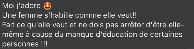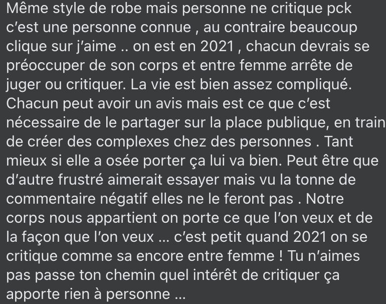 Heureusement, des commentaires bienveillants ont également vu le jour sur la page, soutenant qu’une femme peut s’habiller comme elle le souhaite sans être victime de jugement.