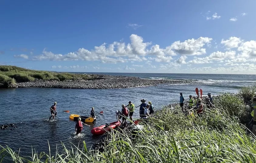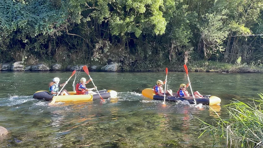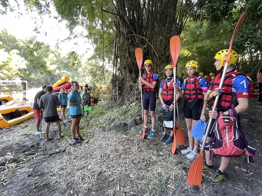 A vos marques, prêts… Pour les collégiens venus participer au championnat de France de raid UNSS, La Réunion n’a pas failli à sa réputation de paradis des sports de pleine nature. Sur le site de Bassin Mangue à Saint-Benoît où le top départ de la compétition a été donné, le soleil était au rendez-vous et la rivière des Marsouins avait un niveau d’eau idéal pour la pratique du packraft. Raphaël, Gaël, Jasmine et Margot, de l’équipe d’Avignon étaient les premiers à mouiller leurs kayaks biplaces gonflables dans le lit de la rivière. Avant le départ, pour chasser le stress, ils ont improvisé une chorégraphie sur du séga, avec les casques sur la tête et les pagaies dans les mains. Puis les choses sérieuses ont commencé avec la descente de la rivière en packraft, jusqu’à l’embouchure des Marsouins, en passant sous les deux ponts de Saint-Benoît. Cette première épreuve s’achève au Ludoparc de la cité des Eaux Vives où les 62 équipes ont séché leurs maillots.