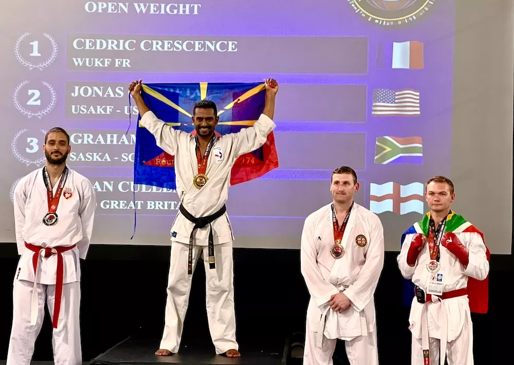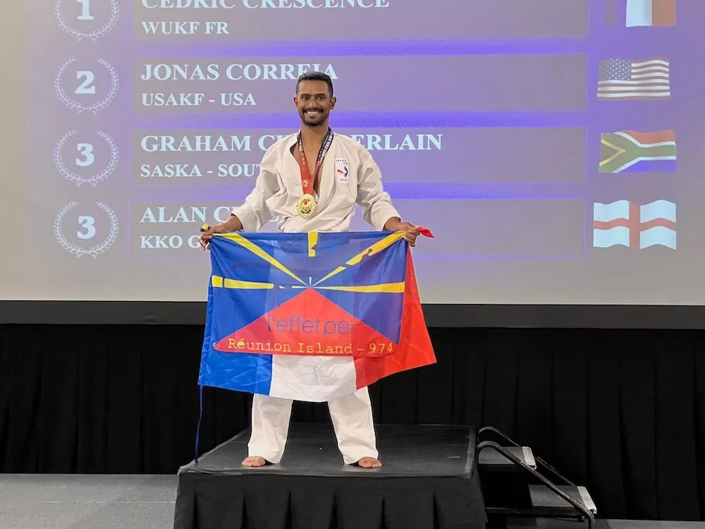 Puis, Cédric CRESCENCE, président du club de karaté de Sans Souci, décroche le Saint-Graal : il remporte le titre de champion du monde en karaté combat (vétéran 1)