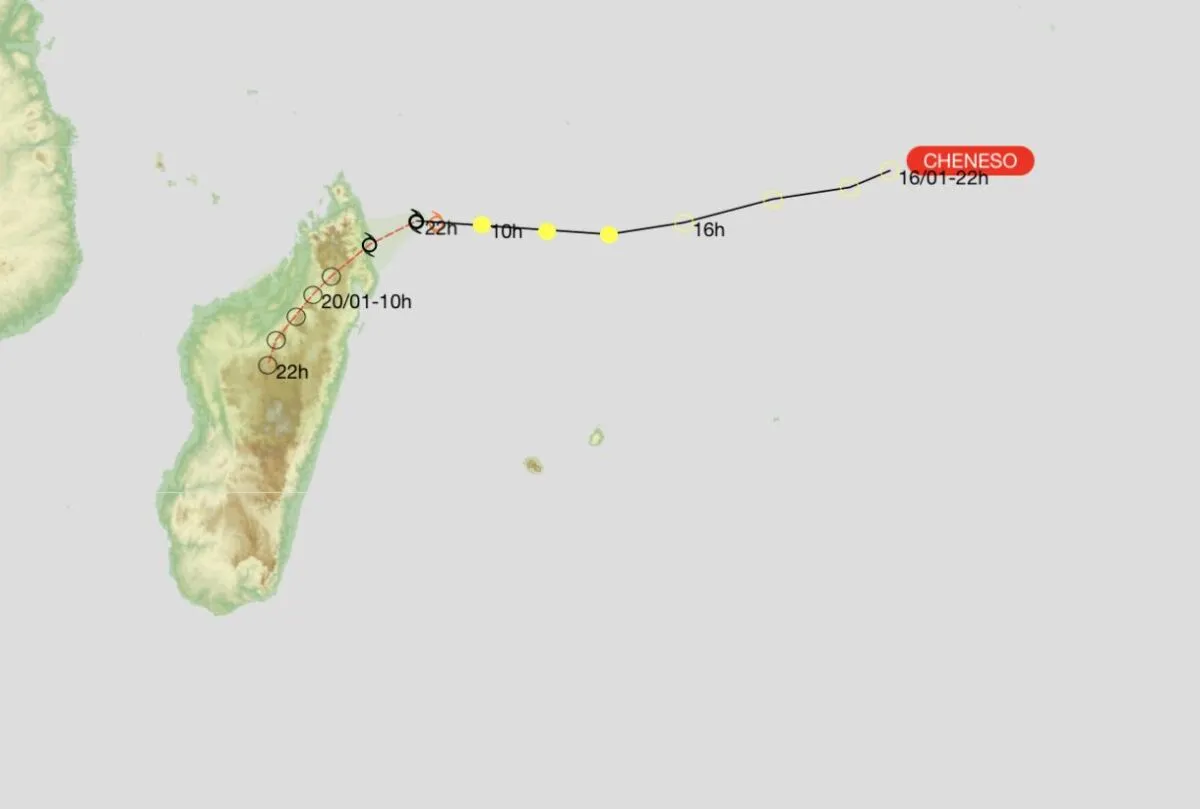 Jeudi après-midi, vers 15h, heure locale, Cheneso a été pointé à Befandriana Nord, dans la partie Ouest de Madagascar, sa trajectoire étant complétement changée puisqu’elle devait sortir en mer dans la partie orientale de l’île, pour se diriger vers La Réunion. Le système devrait finalement sortir en mer et mourrir dans le canal de Mozambique, ce week-end.