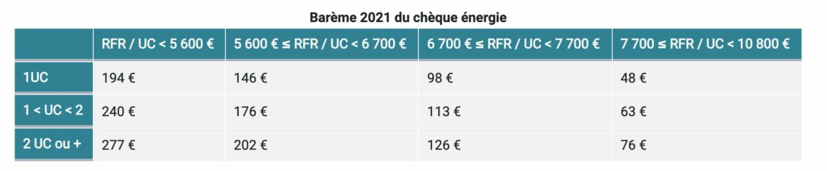 Depuis le 1er janvier 2021, la valeur faciale TTC du chèque énergie correspond au barème suivant :