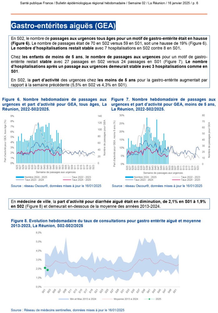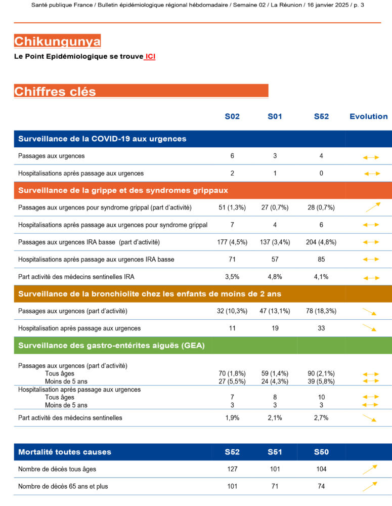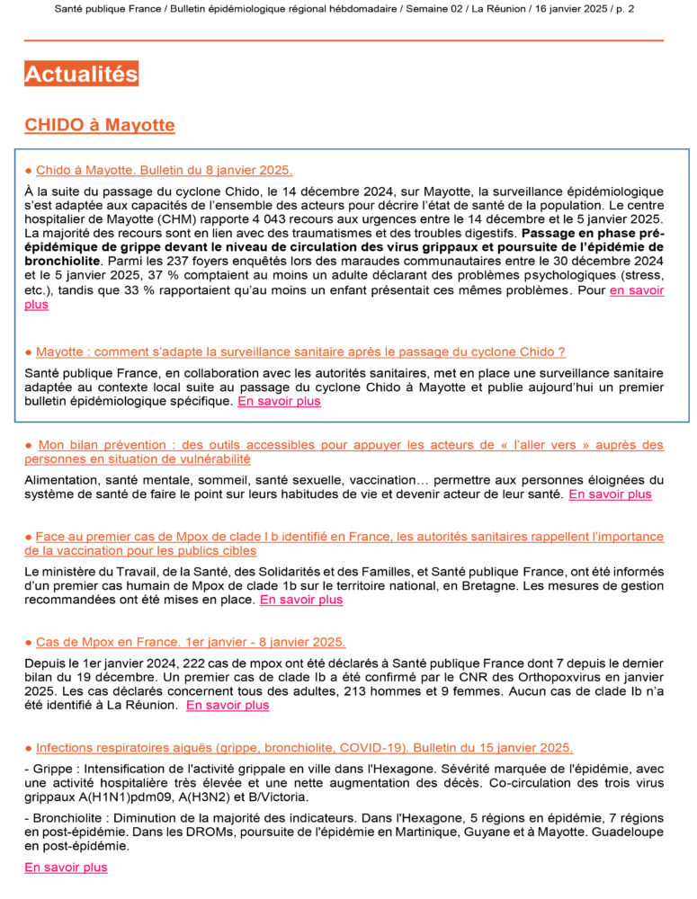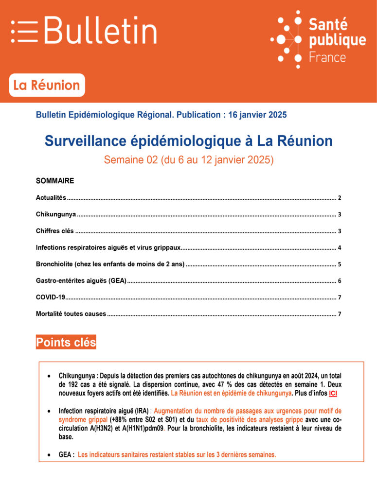 Chikungunya : Depuis le début de l’épidémie en août 2024, 192 cas ont été recensés. La propagation reste active, avec 47 % des cas signalés dès la première semaine de janvier. Deux nouveaux foyers ont été identifiés, et La Réunion est actuellement en pleine épidémie de chikungunya.