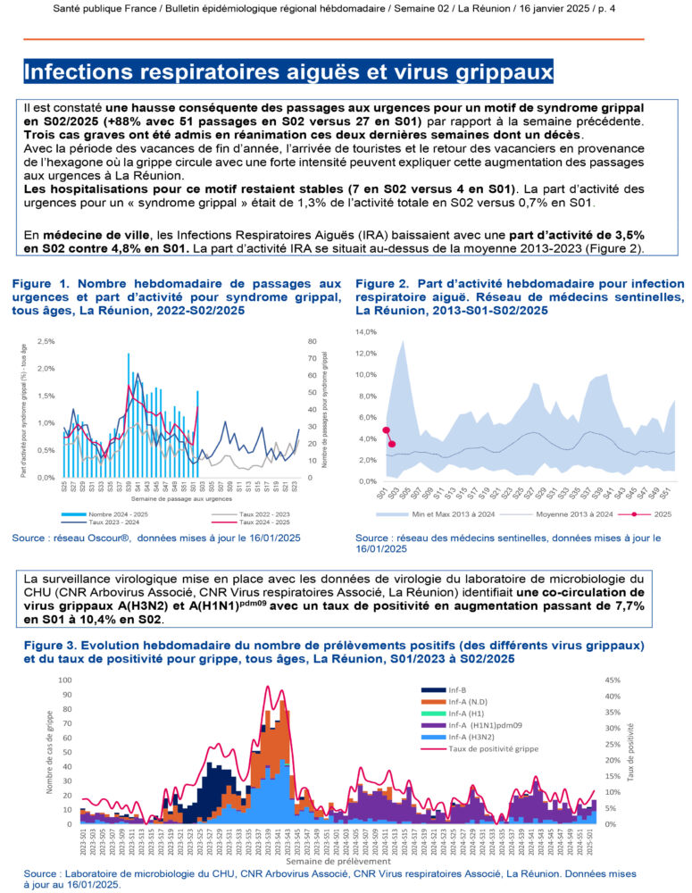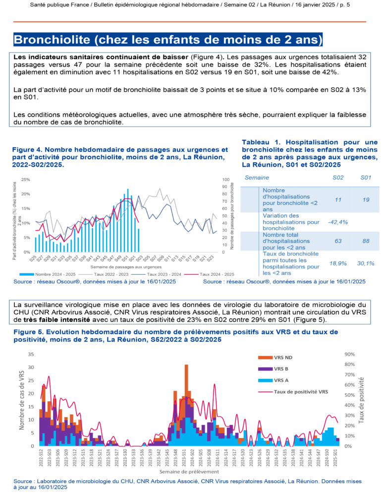 Infection respiratoire aigüe (IRA) : Les passages aux urgences pour syndrome grippal ont fortement augmenté, avec une hausse de 88 % entre la semaine 1 et la semaine 2 de janvier. Le taux de positivité des analyses de grippe montre une co-circulation des souches A(H3N2) et A(H1N1)pdm09. En revanche, les indicateurs pour la bronchiolite restent à des niveaux bas.
