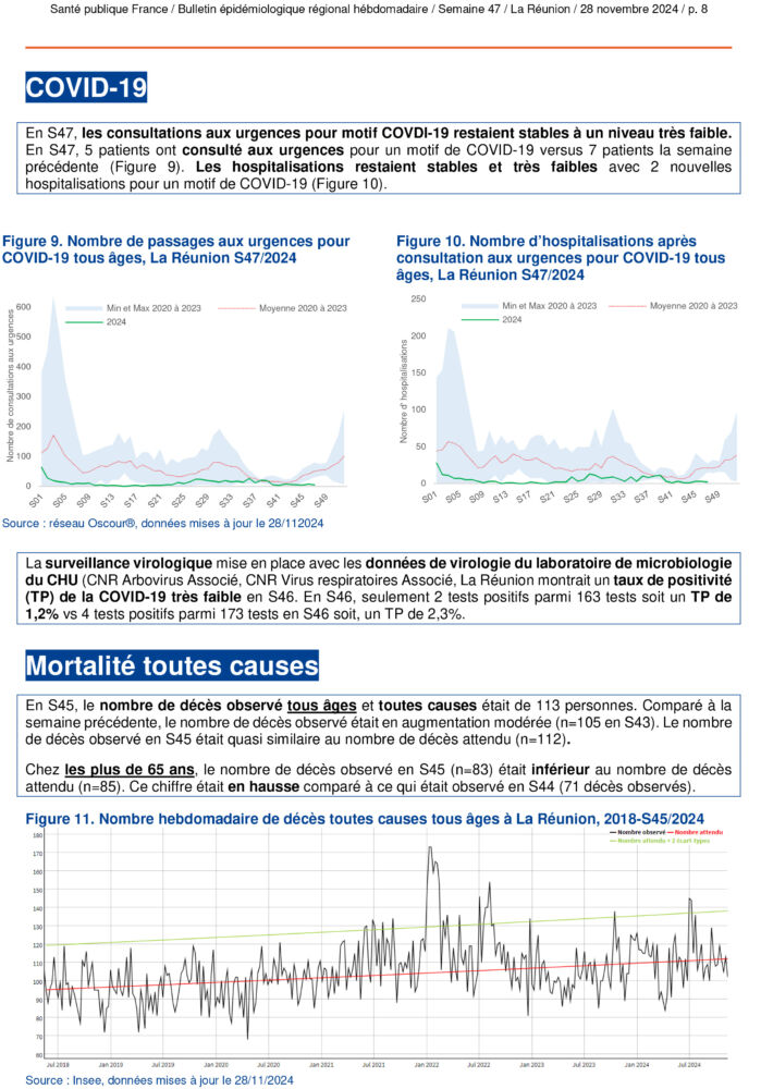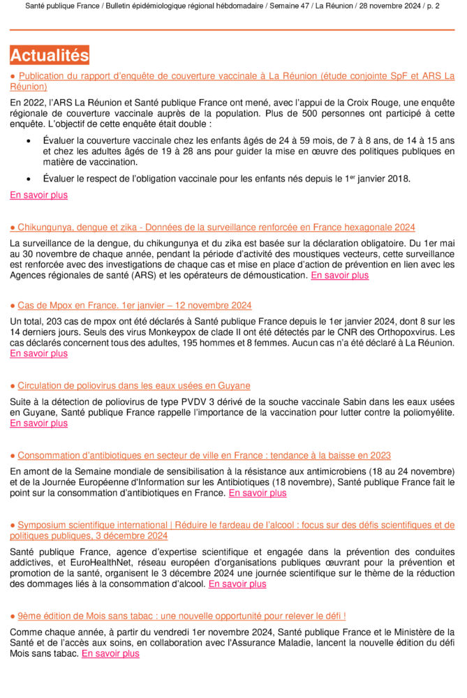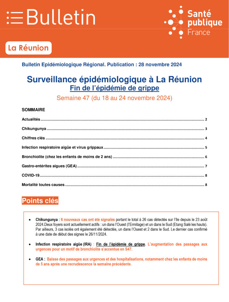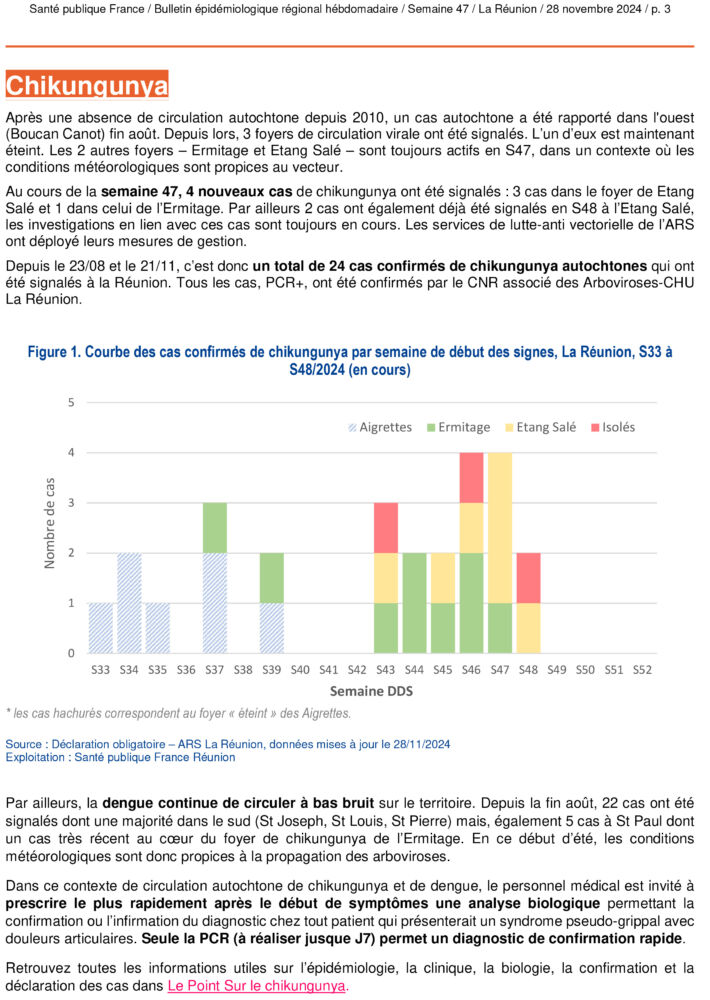 - Chikungunya : 6 nouveaux cas ont été signalés portant le total à 26 cas détectés sur l’île depuis le 23 août 2024. Deux foyers sont actuellement actifs : un dans l’Ouest (l’Ermitage) et un dans le Sud (Etang Salé les hauts). Par ailleurs, 3 cas isolés ont également été détectés, un dans l’Ouest et 2 dans le Sud. Le dernier cas confirmé à une date de début des signes le 26/11/2024.