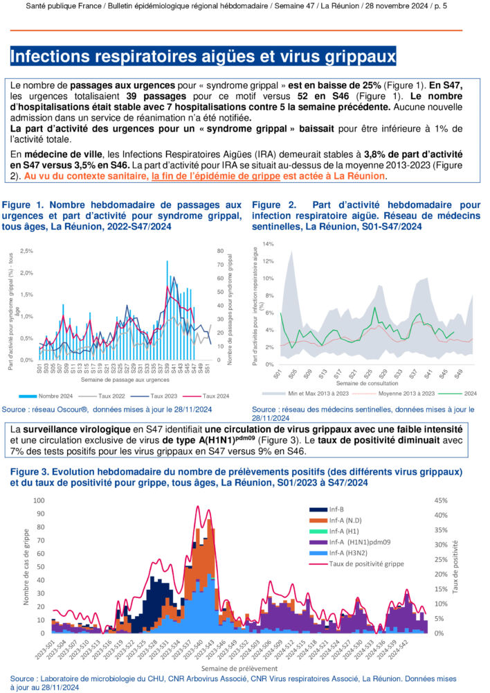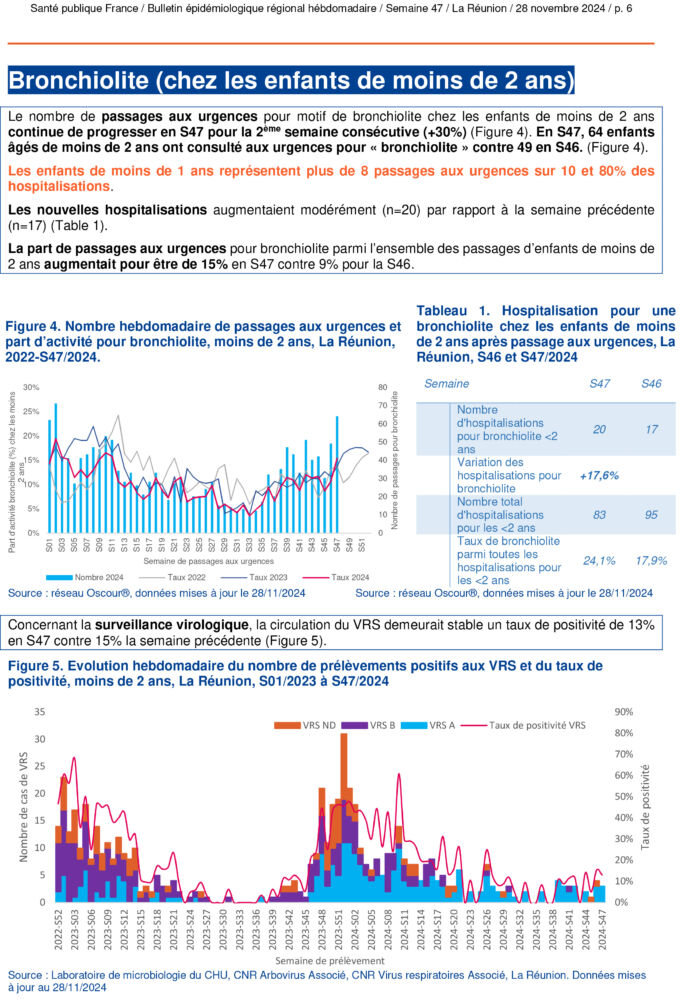 · Infection respiratoire aigüe (IRA) : Fin de l’épidémie de grippe. L’augmentation des passages aux urgences pour un motif de bronchiolite s’accentue en S47.