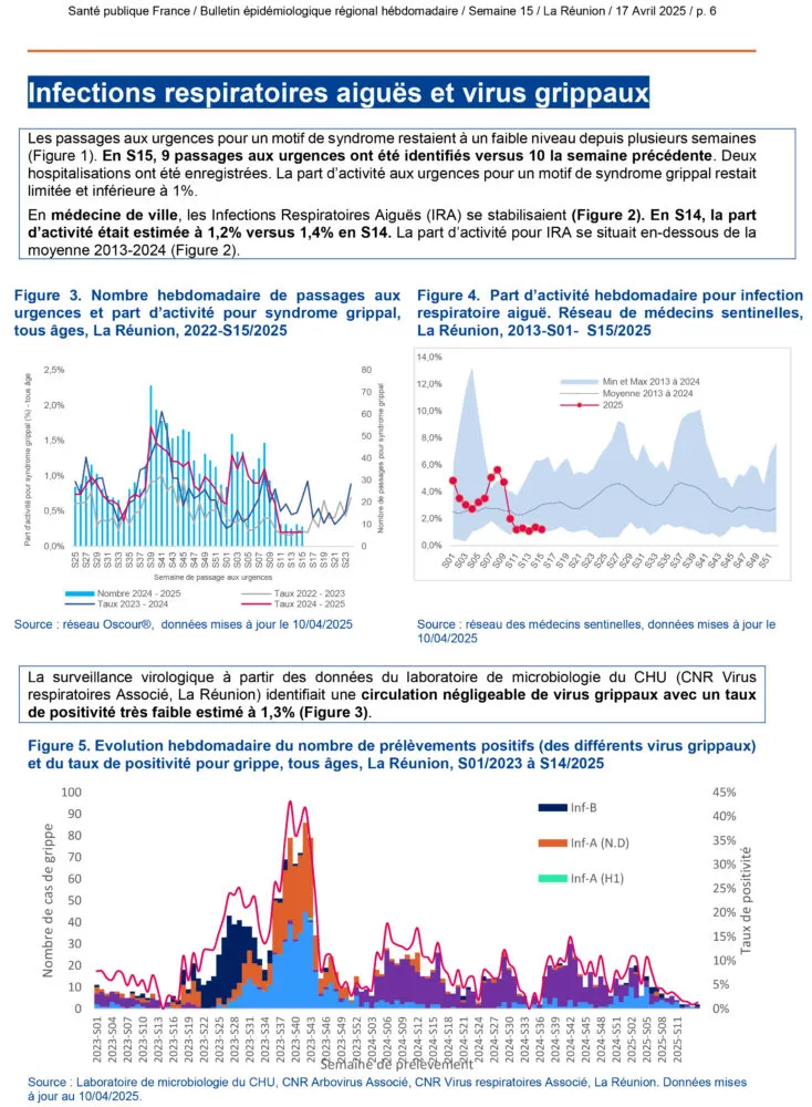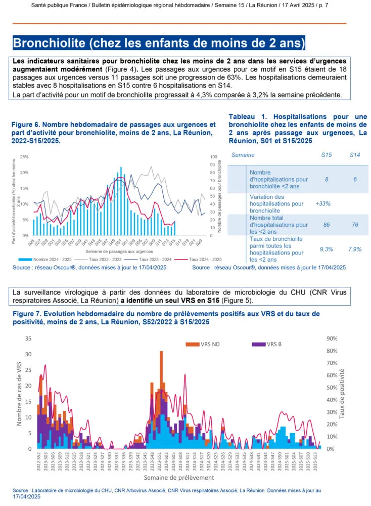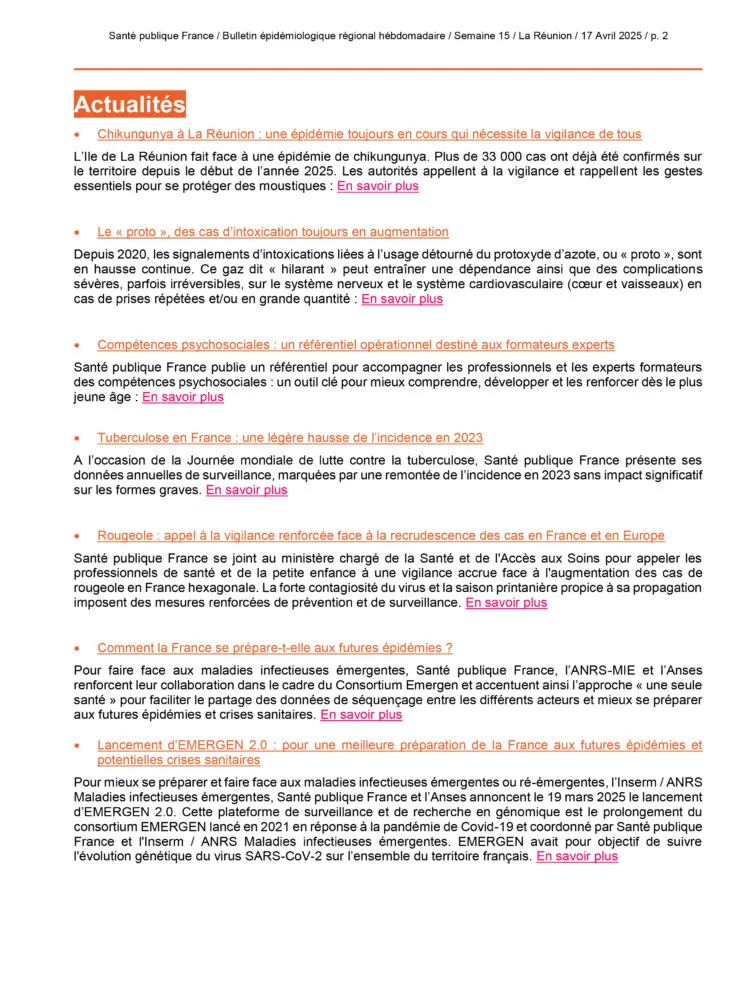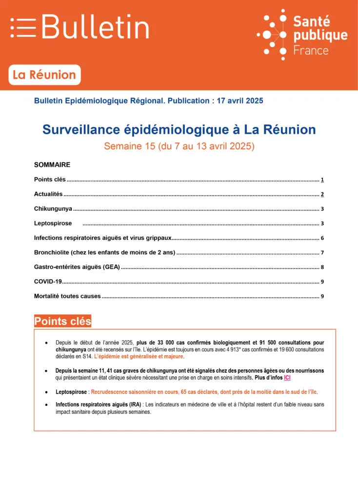 Depuis la semaine 11, 41 cas graves de chikungunya ont été signalés chez des personnes âgées ou des nourrissons qui présentaient un état clinique sévère nécessitant une prise en charge en soins intensifs. Plus d’infos ICI<https://www.santepubliquefrance.fr/regions/ocean-indien/documents/bulletin-regional/2025/chikungunya-et-dengue-a-la-reunion.-bulletin-du-16-avril-2025>