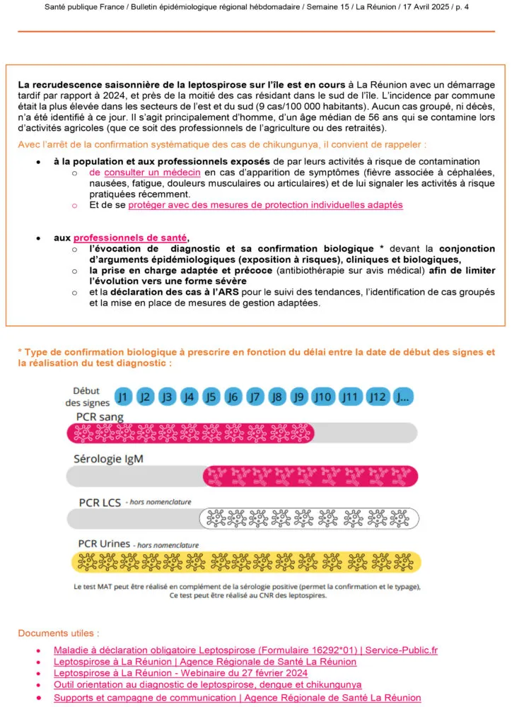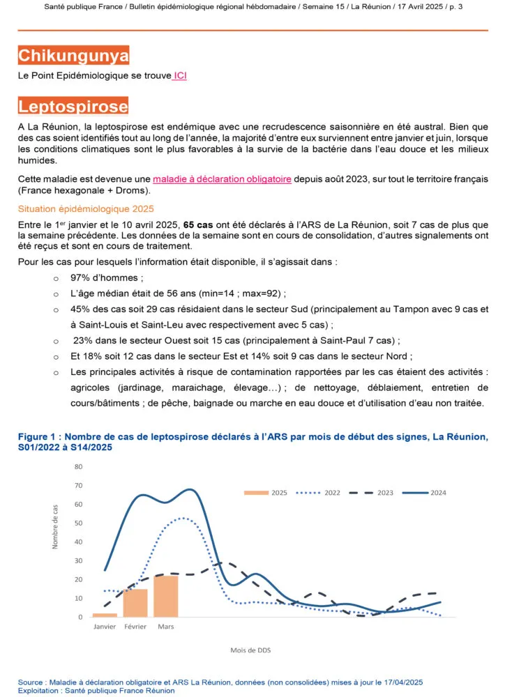 •                    Leptospirose : Recrudescence saisonnière en cours, 65 cas déclarés, dont près de la moitié dans le sud de l’île.