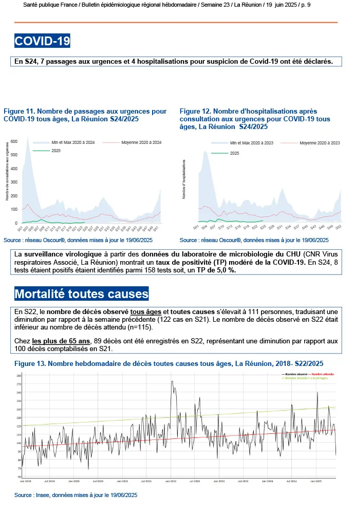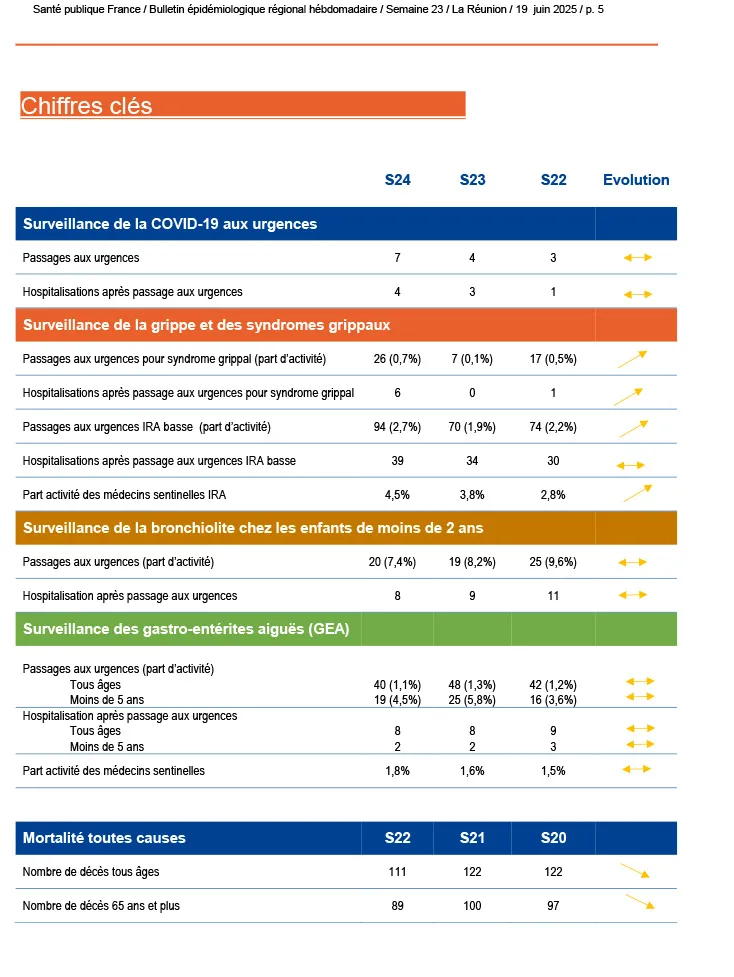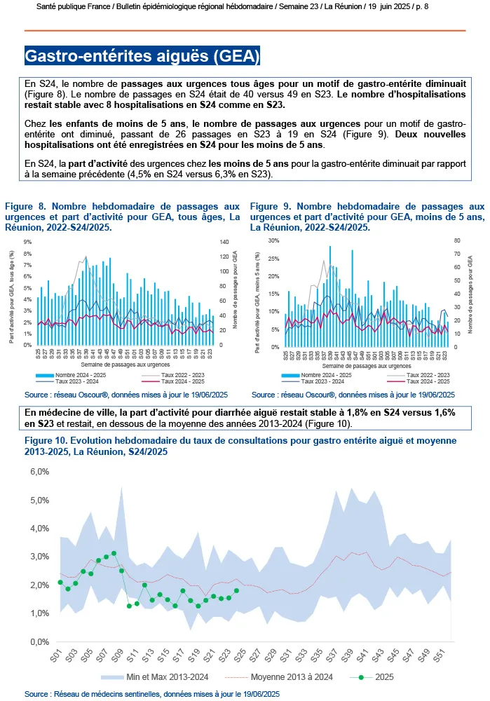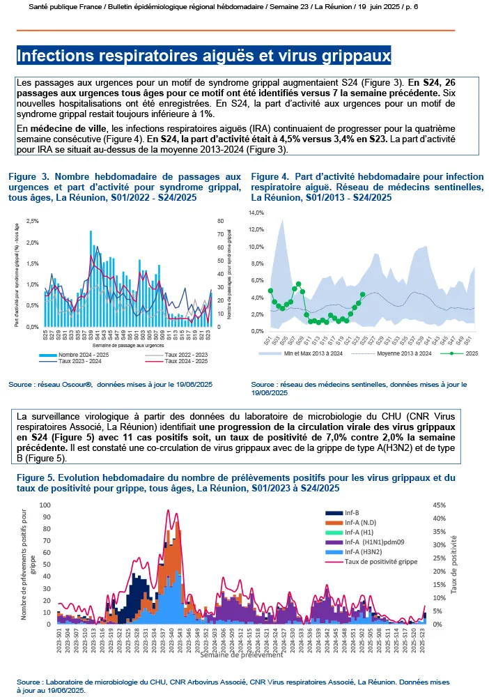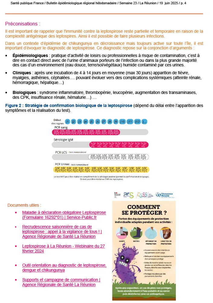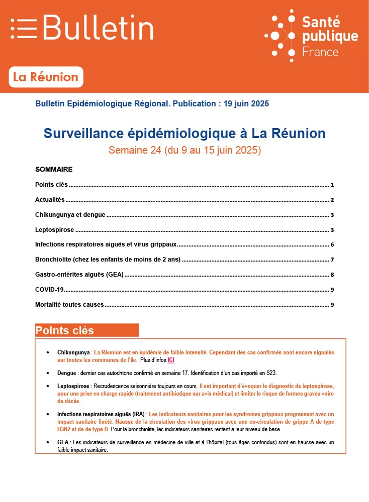 À La Réunion, plusieurs maladies infectieuses font actuellement l’objet d’une surveillance renforcée par les autorités sanitaires. Si le chikungunya circule à faible intensité, la dengue continue d’être signalée avec des cas autochtones et importés. La leptospirose connaît une recrudescence saisonnière préoccupante, nécessitant une vigilance accrue. En parallèle, les infections respiratoires aiguës progressent légèrement avec une hausse des virus grippaux, tandis que les cas de gastro-entérite aiguë sont en augmentation.