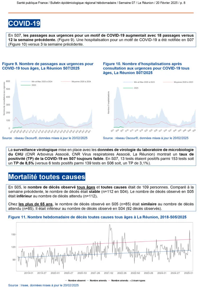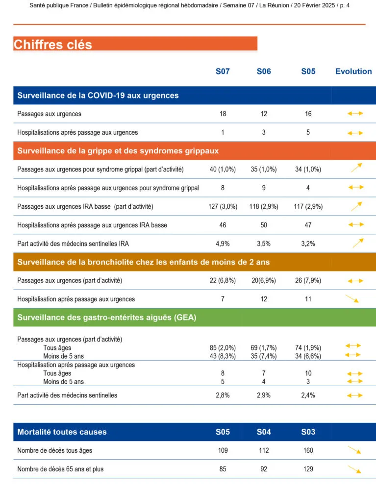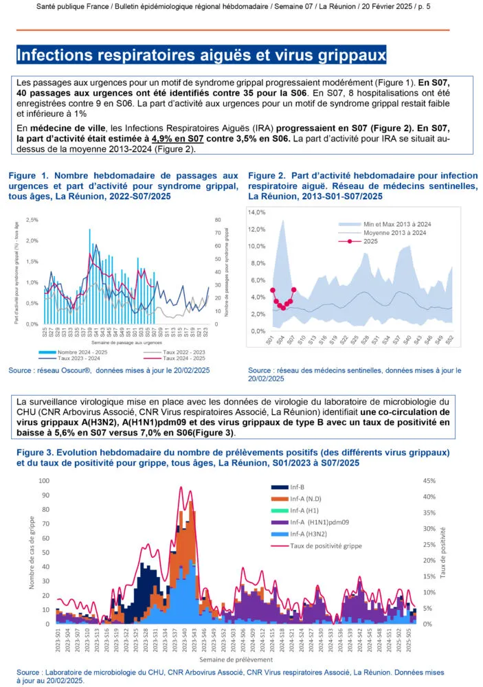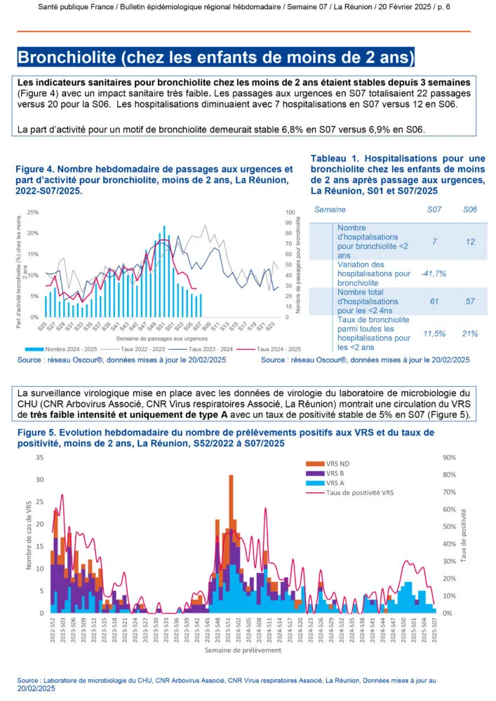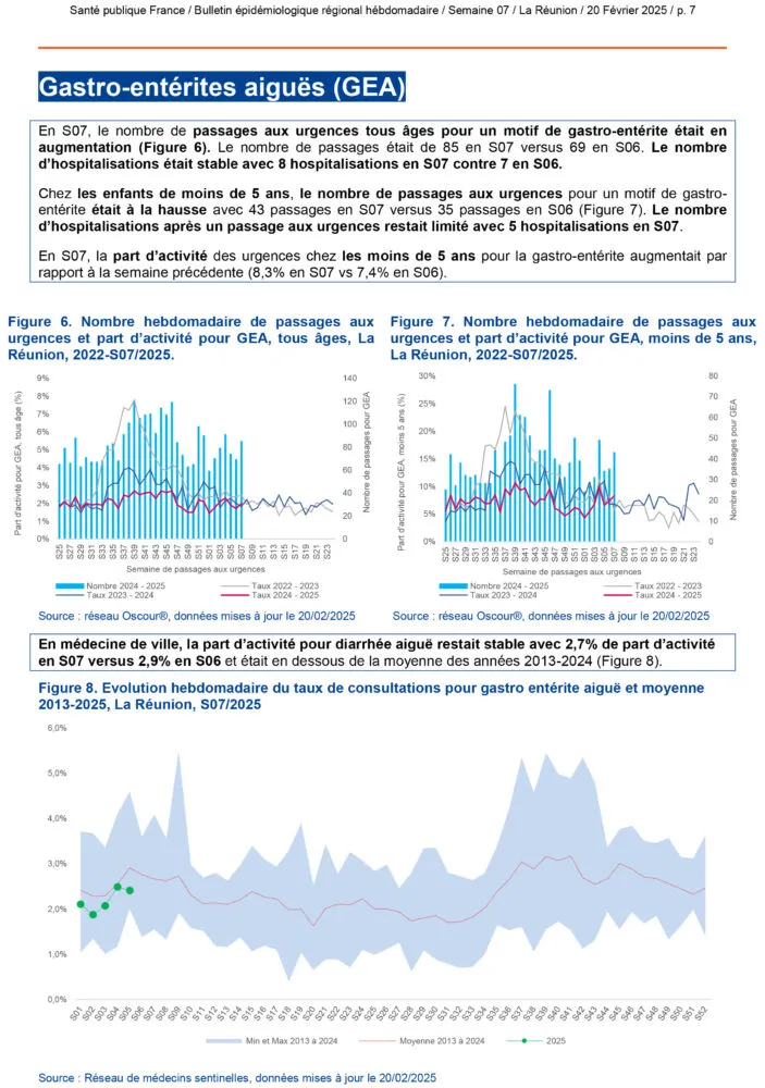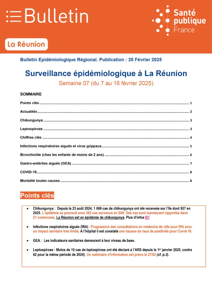 • Chikungunya :  Depuis le 23 août 2024, 1 069 cas de chikungunya ont été recensés sur l’île dont 927 en 2025. L’épidémie se poursuit avec 362 cas survenus en S06. Des cas sont maintenant rapportés dans 21 communesLa Réunion est en épidémie de chikungunya.