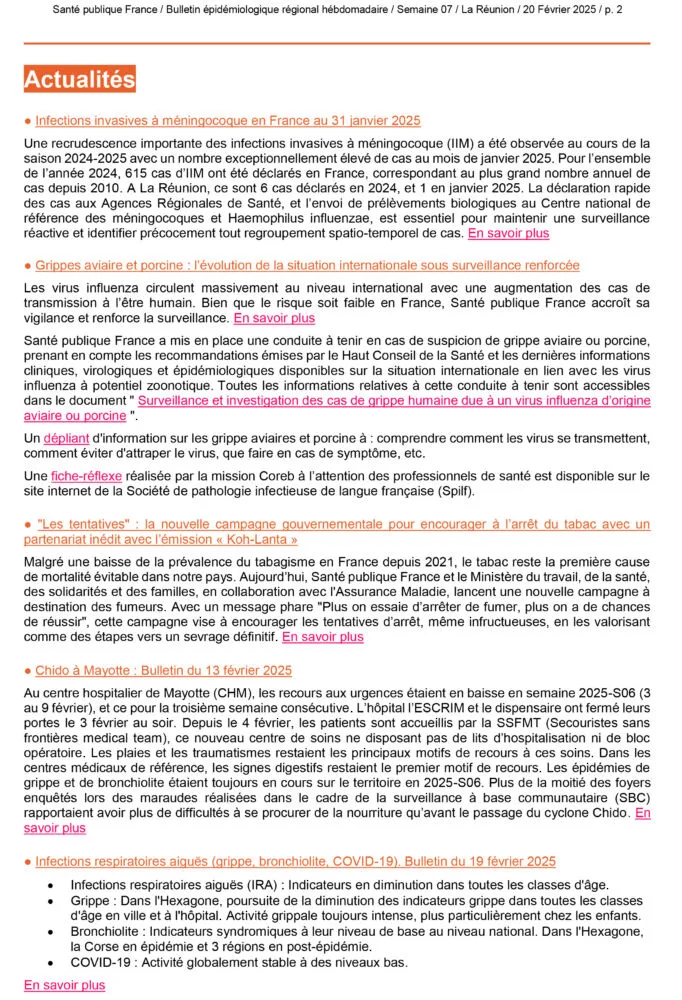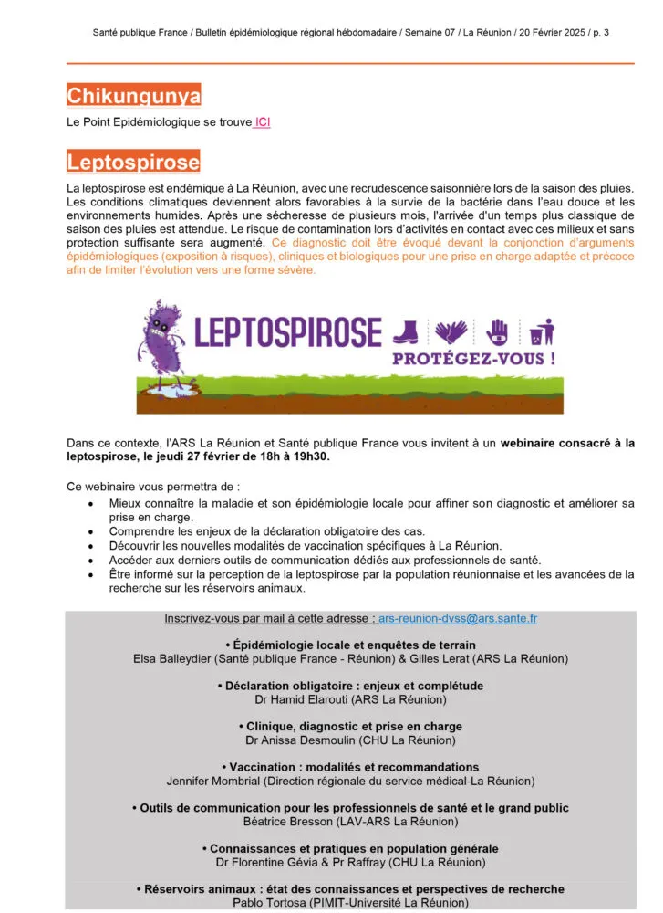 • Leptospirose : Moins de 10 cas de leptospirose ont été déclaré à l’ARS depuis le 1er janvier 2025, contre 62 pour la même période de 2024). Un webinaire d’information est prévu le 27/02 (cf. p.3).