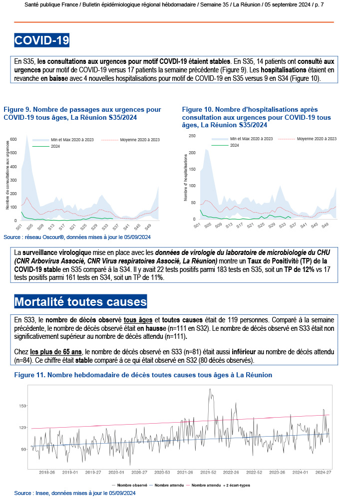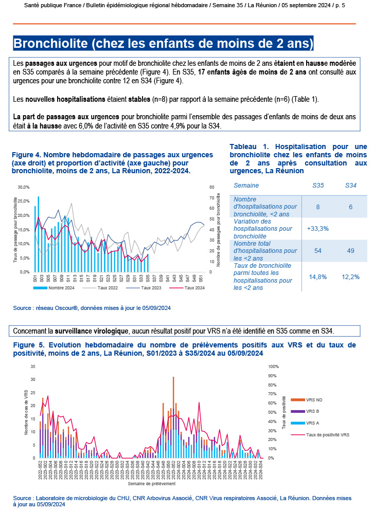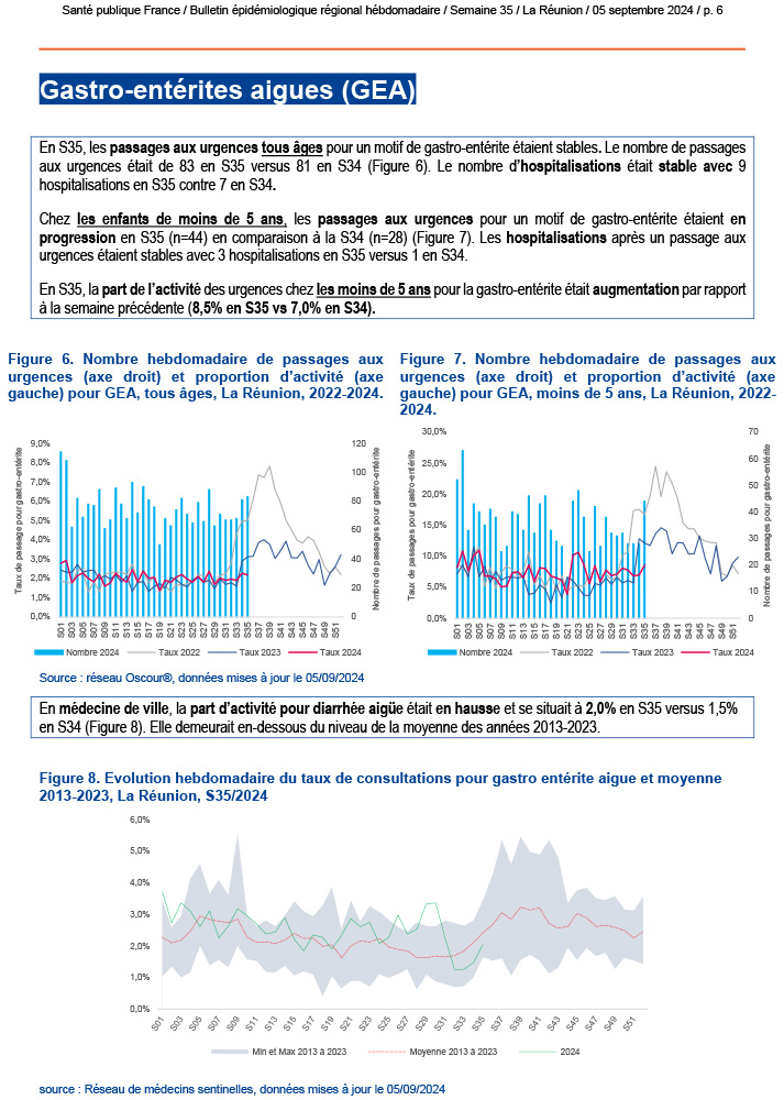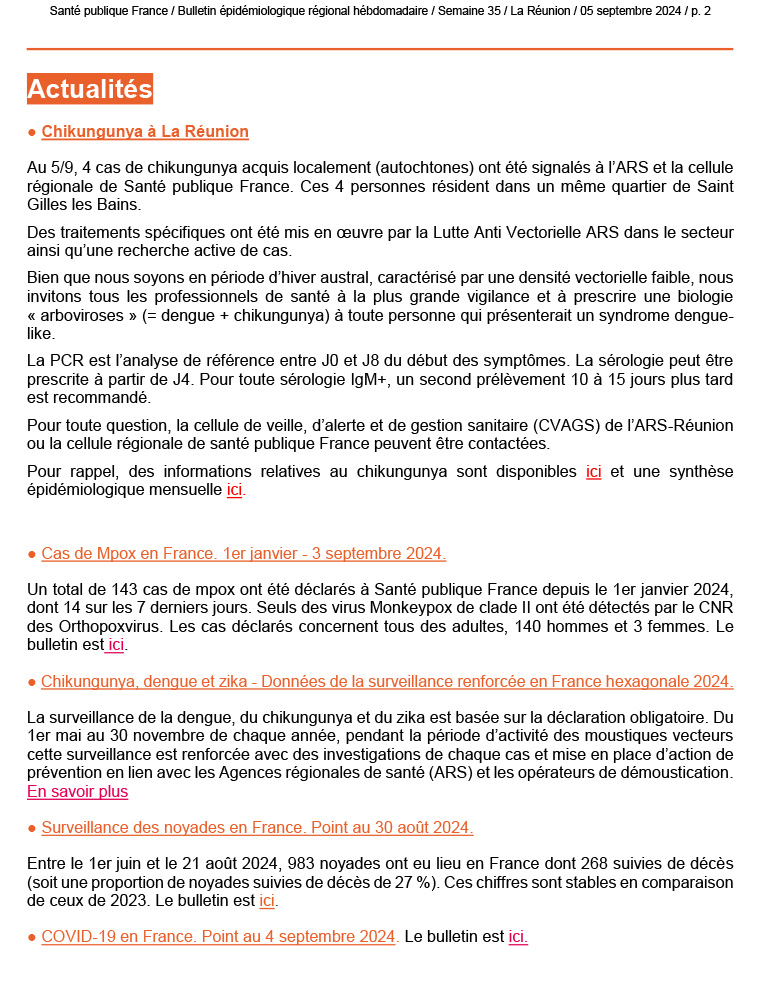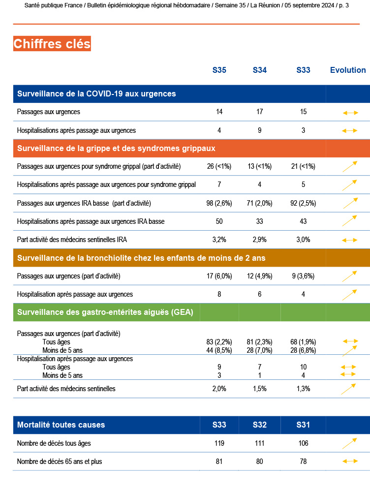 Le point épidémiologique régional de La Réunion pour la semaine 35, couvrant la période du 26 août au 1er septembre 2024, met en avant plusieurs éléments importants concernant la situation sanitaire.
