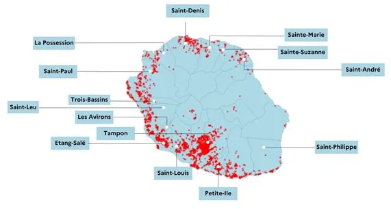 Au cours des dernières semaines, une circulation virale en progression a été notée dans les zones Ouest et Nord : Saint-Denis (74 cas), Saint-Leu (160 cas) et Saint-Paul (174 cas).