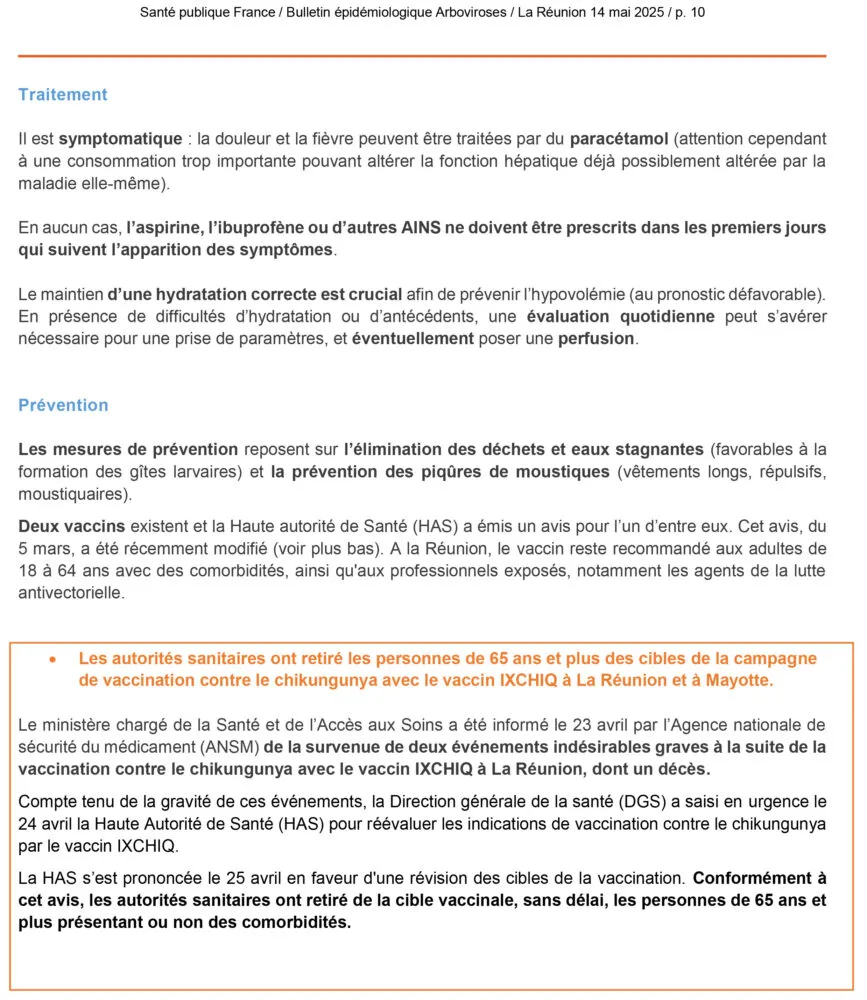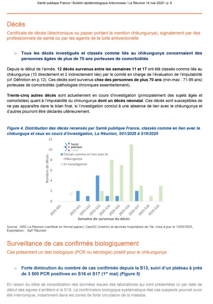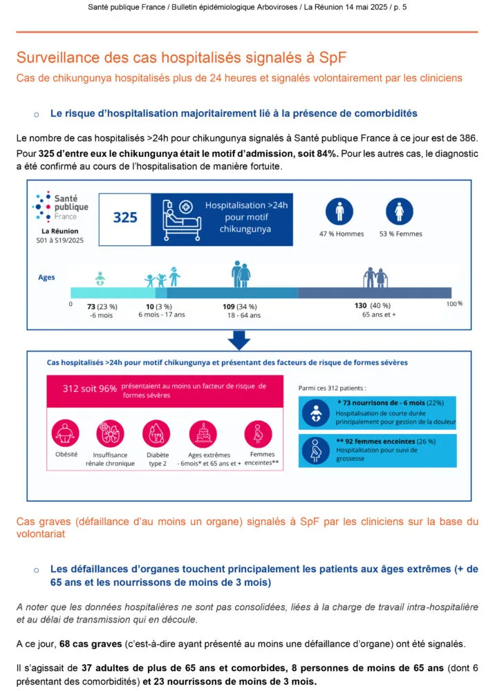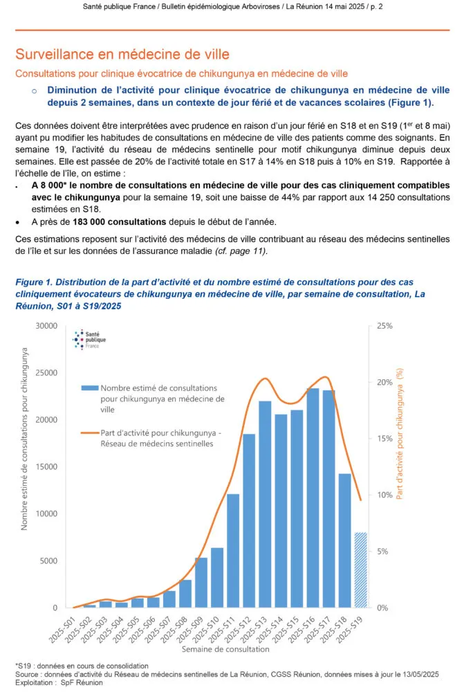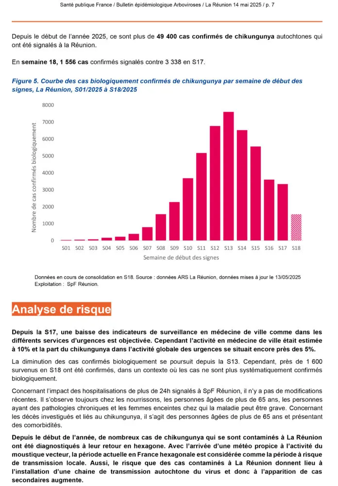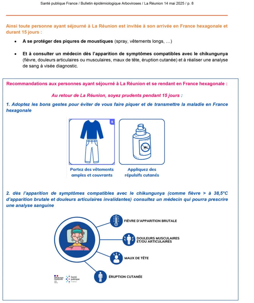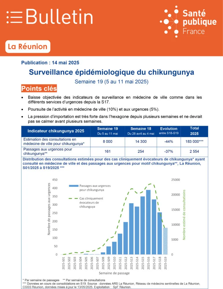 Voici l’essentiel à retenir du bulletin épidémiologique de Santé publique France du 14 mai 2025 sur le chikungunya à La Réunion :
