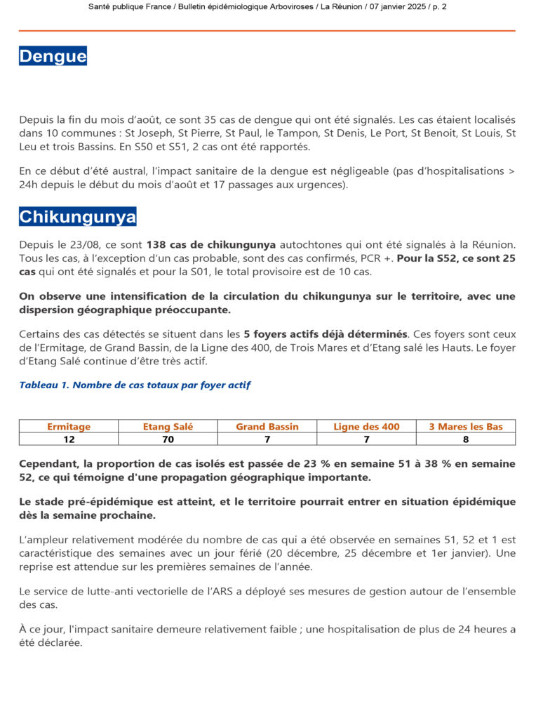 Depuis le 23 août, 138 cas de chikungunya ont été recensés. La dispersion des cas s’intensifie, avec 38 % des infections détectées en semaine 52 étant isolées. Un passage au niveau épidémique est jugé probable pour la semaine prochaine, avec déjà une première hospitalisation de plus de 24 heures enregistrée.