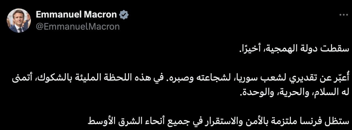 Le président Emmanuel Macron a tout de suite réagi sur les réseaux sociaux en arabe : « L’État barbare est enfin tombé. J’exprime ma gratitude au peuple syrien pour son courage et sa patience. En ce moment d’incertitude, je lui souhaite paix, liberté et unité. La France reste attachée à la sécurité et à la stabilité dans tout le Moyen-Orient »
