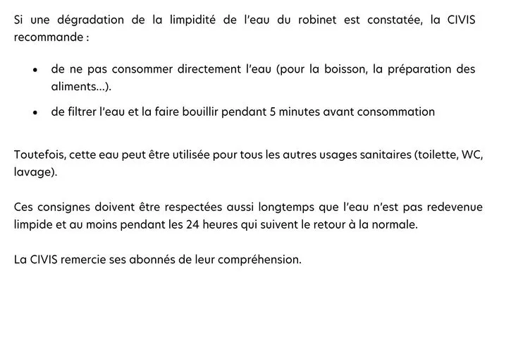 CIVIS/Collectivités Cilaos : dégradation de la qualité de l’eau par La Rédaction 2 avril 2022 1 min de lecture La CIVIS informe ses abonnés de la ville de Cilaos, qu’en raison des dernières précipitations, la qualité de l’eau distribuée est susceptible de se dégrader sur l’ensemble du cirque. Ne manquez pas toute l’actualité de La Réunion ! Abonnez-vous à la newsletter de Free Dom ! Valider Partager Facebook Twitter Pinterest Linkedin Whatsapp Reddit Email Catégorie: CilaosCIVIS Vous pourriez être intéressé par 2 décembre 2025 La CIVIS lance une campagne choc contre l’errance animale 21 novembre 2025 Plus de 49 702 tonnes de déchets collectées en 2024 : La CIVIS s’engage pour un avenir durable 21 novembre 2025 Petite-Île : grande collecte de vêtements et de petits appareils électriques, samedi 22 novembre de 8h à 14h La Rédaction Laisser un commentaire Annuler la réponseYour email address will not be published. Enregistrer mon nom, mon e-mail et mon site dans le navigateur pour mon prochain commentaire. Current ye@r * Leave this field empty Article précédent Une convention signée avec l’association « Colosse aux pieds d’Argile » Article suivant Intempéries à St-Denis : l’ensemble des stades de football de la ville fermés Articles récents... Hommage à Johnny Hallyday sur Free Dom 2 ce 5 décembre Mardi 30 décembre 2025 – Météo, éphéméride et horoscope du jour Saint-Joseph : découverte de 2337 plants de cannabis, arrestation de 2 individus Point sur le réseau routier départemental, 29 décembre à 16H30 Suicide sur le pont de la Rivière d’Abord : importante mobilisation des secours et des forces de l’ordre Radier submergé à Ilet Furcy : la route de Cilaos fermée à la circulation cette nuit Fortes pluies : appel à la plus grande prudence à Saint-Paul Saint-Gilles-les-Bains : une route impraticable, les riverains montent au créneau (VIDEOS) Très grands excès de vitesse : un délit passible de prison depuis le 29 décembre 2025 Fermeture temporaire du sentier de la Canalisation des Orangers (cirque de Mafate)