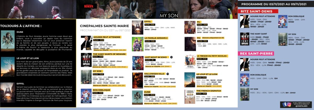 Envie de vous détendre ? On vous propose une sélection de films à découvrir dans les cinémas de l’île pour la semaine du 03 au 09 novembre. À noter que le pass sanitaire est obligatoire pour toutes les séances pour les 12 ans et plus.