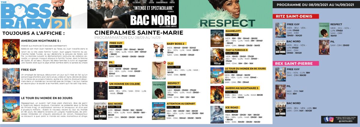 Envie de vous détendre ? On vous propose une sélection de films à découvrir dans les cinémas de l’île pour la semaine du 08 au 14 septembre. À noter que le pass sanitaire est obligatoire pour toutes les séances pour les 18 ans et plus et que suite aux dernières mesures préfectorales, les salles du Réseau ICC ont de nouveaux horaires :
