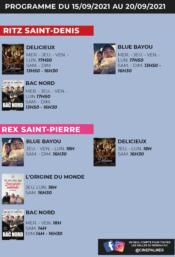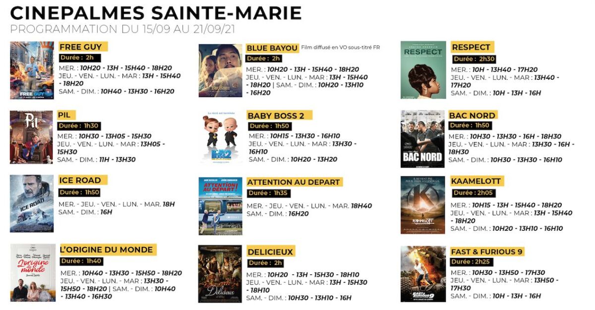 Envie de vous détendre ? On vous propose une sélection de films à découvrir dans les cinémas de l’île pour la semaine du 08 au 14 septembre. À noter que le pass sanitaire est obligatoire pour toutes les séances pour les 18 ans et plus et que suite aux dernières mesures préfectorales, les salles du Réseau ICC ont de nouveaux horaires :
