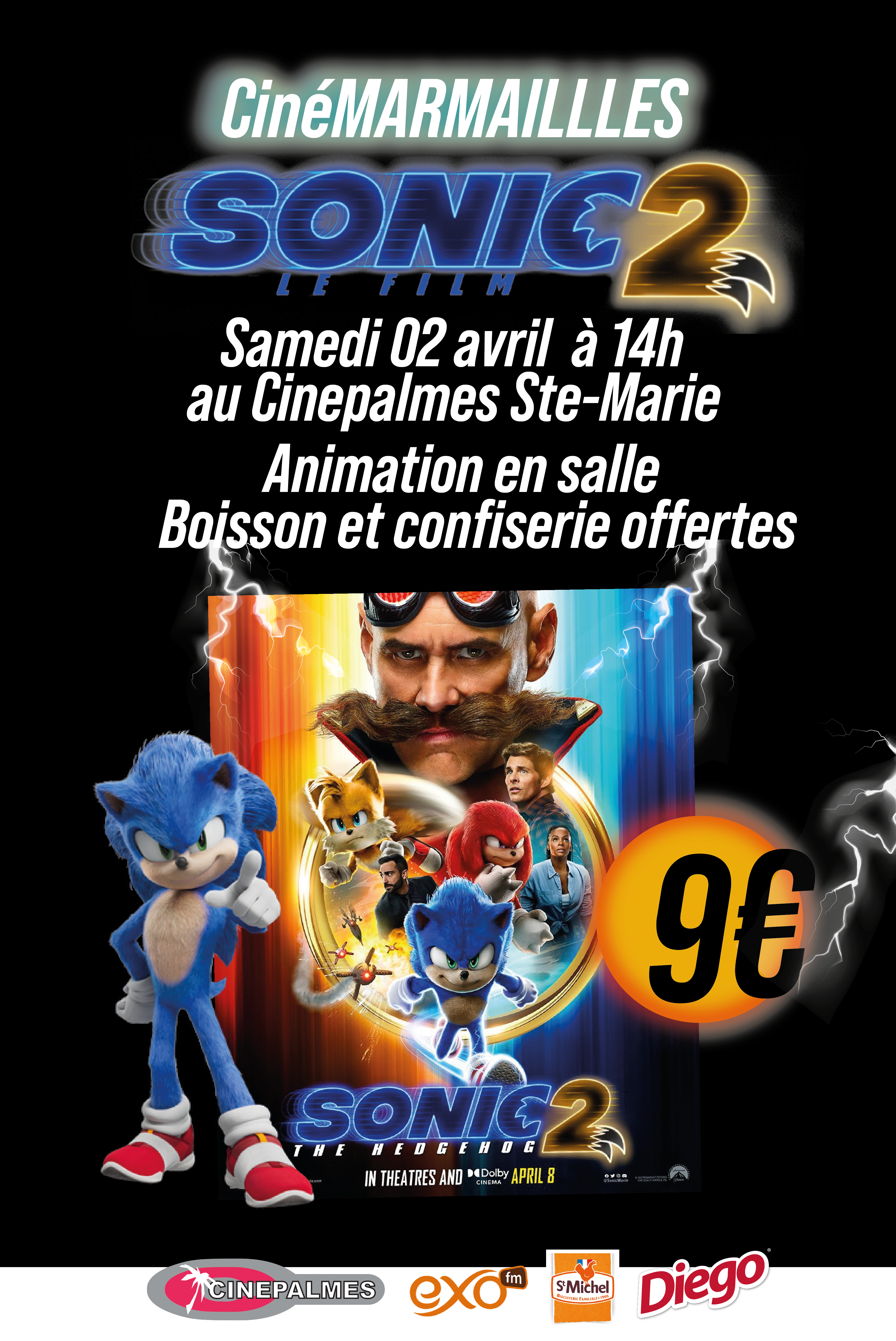 CinéMARMAILLES avec Sonic 2 samedi 2 avril à 14h au Cinepalmes Ste-Marie. Boisson et confiserie offertes, animation en salle !