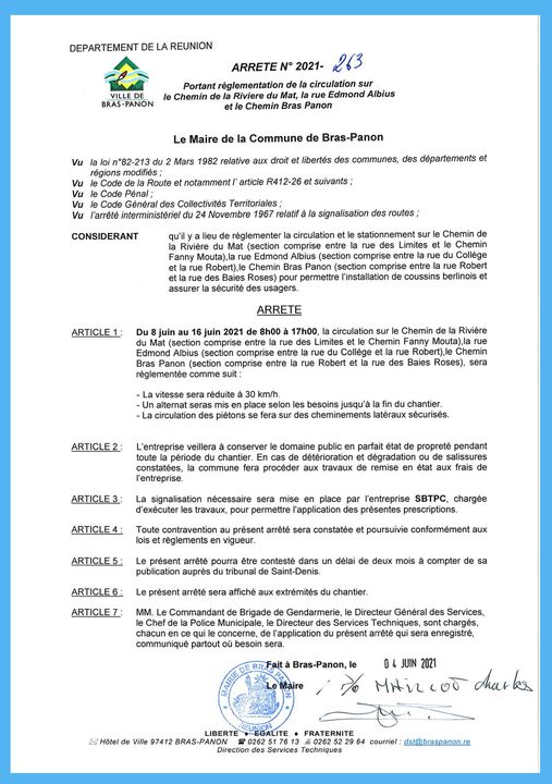 Arrêté portant règlementation de la circulation sur le chemin de la Rivière du Mât, la rue Edmond Albius et le chemin Bras-Panon.