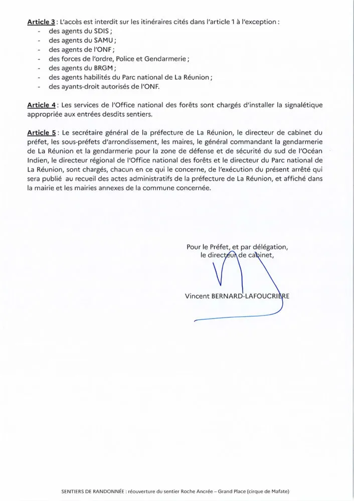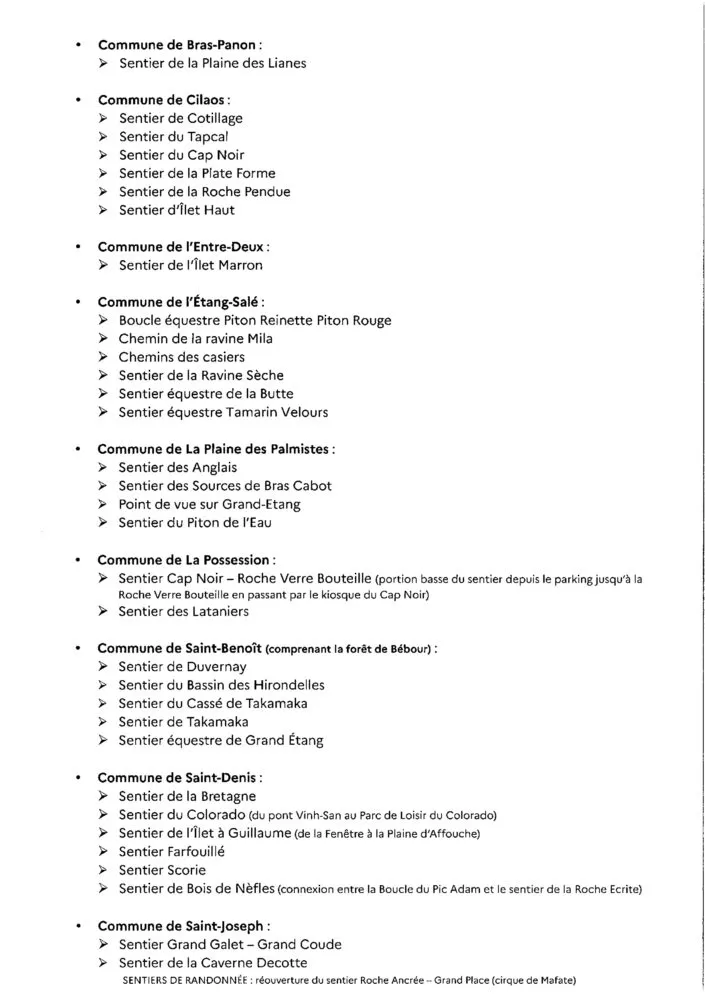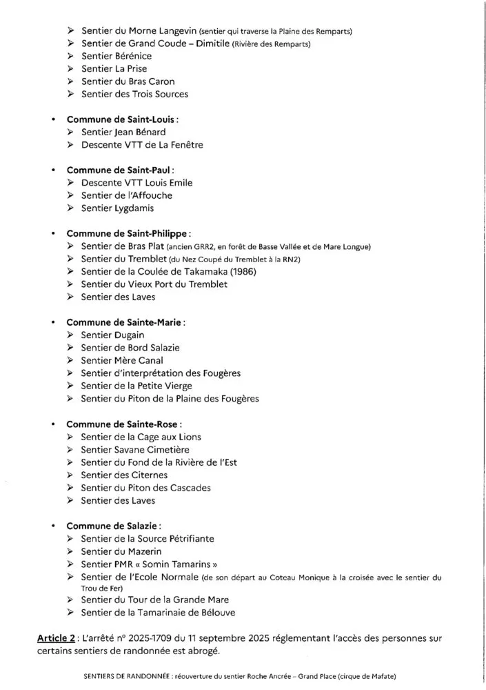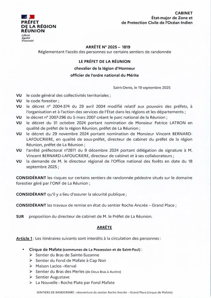 Actualités Cirque de Mafate : réouverture du sentier Roche Ancrée – Grand Place par La Rédaction 19 septembre 2025 1 min de lecture Suite aux travaux réalisés par les équipes de l’ONF, cette instance annonce la réouverture du sentier Roche Ancrée – Grand Place (cirque de Mafate). Ne manquez pas toute l’actualité de La Réunion ! Abonnez-vous à la newsletter de Free Dom ! Valider Partager Facebook Twitter Pinterest Linkedin Whatsapp Reddit Email Vous pourriez être intéressé par 30 décembre 2025 Mardi 30 décembre 2025 – Météo, éphéméride et horoscope du jour 29 décembre 2025 Saint-Joseph : découverte de 2337 plants de cannabis, arrestation de 2 individus 29 décembre 2025 Point sur le réseau routier départemental, 29 décembre à 16H30 La Rédaction Laisser un commentaire Annuler la réponseYour email address will not be published. Enregistrer mon nom, mon e-mail et mon site dans le navigateur pour mon prochain commentaire. Current ye@r * Leave this field empty Article précédent Vagues-submersion : vigilance jaune entre la Pointe des Galets et la Pointe de la Table jusqu’à samedi Article suivant Alzheimer : Saint-André mobilisée pour la santé et la mémoire Articles récents... Hommage à Johnny Hallyday sur Free Dom 2 ce 5 décembre Mardi 30 décembre 2025 – Météo, éphéméride et horoscope du jour Saint-Joseph : découverte de 2337 plants de cannabis, arrestation de 2 individus Point sur le réseau routier départemental, 29 décembre à 16H30 Suicide sur le pont de la Rivière d’Abord : importante mobilisation des secours et des forces de l’ordre Radier submergé à Ilet Furcy : la route de Cilaos fermée à la circulation cette nuit Fortes pluies : appel à la plus grande prudence à Saint-Paul Saint-Gilles-les-Bains : une route impraticable, les riverains montent au créneau (VIDEOS) Très grands excès de vitesse : un délit passible de prison depuis le 29 décembre 2025 Fermeture temporaire du sentier de la Canalisation des Orangers (cirque de Mafate)