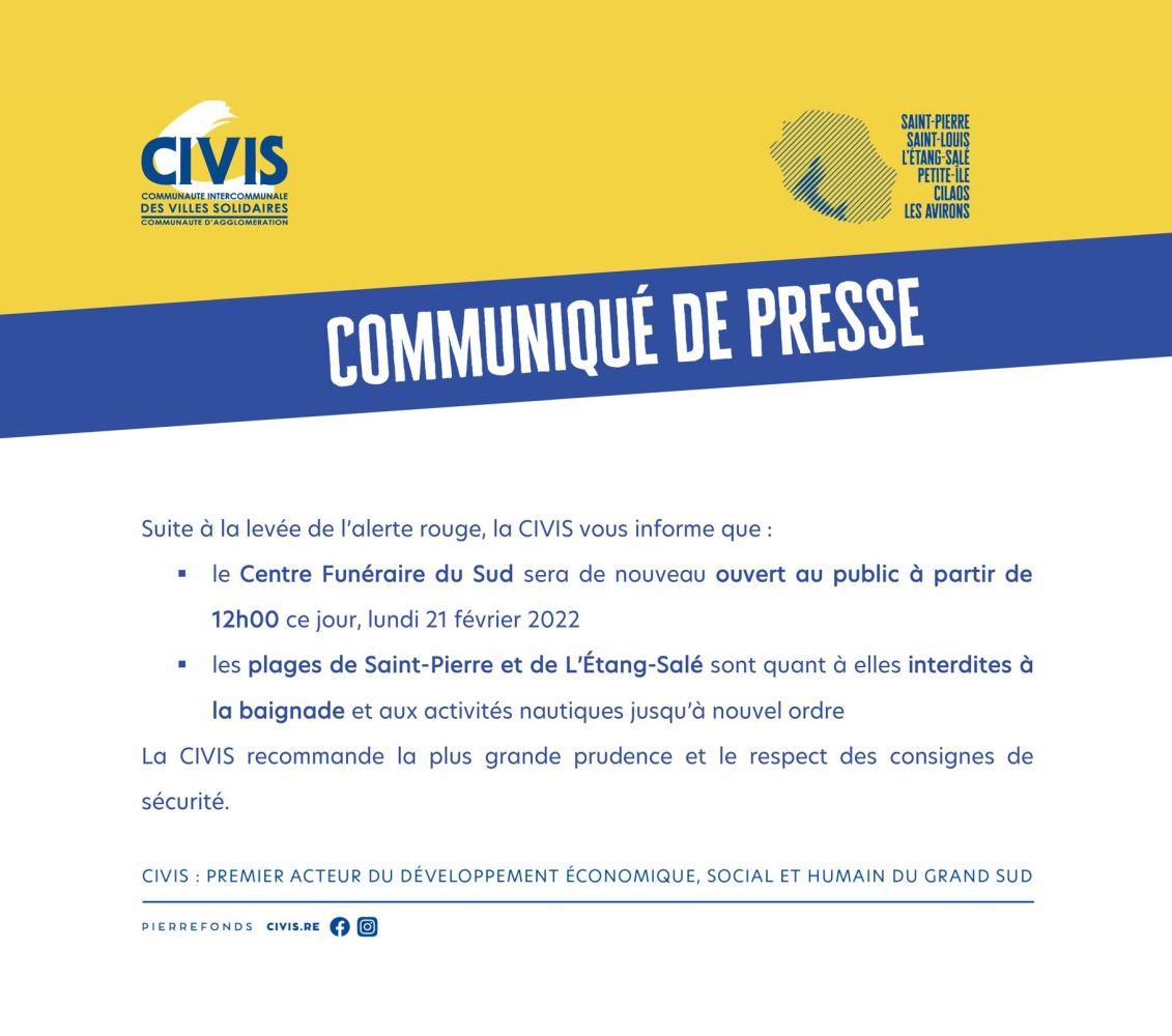 Suite à la levée de l’alerte rouge, la CIVIS vous informe que :