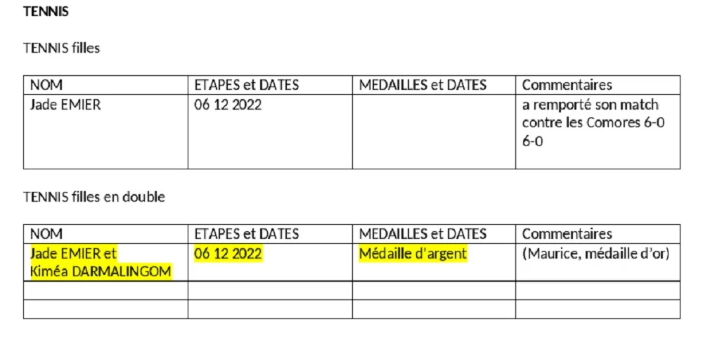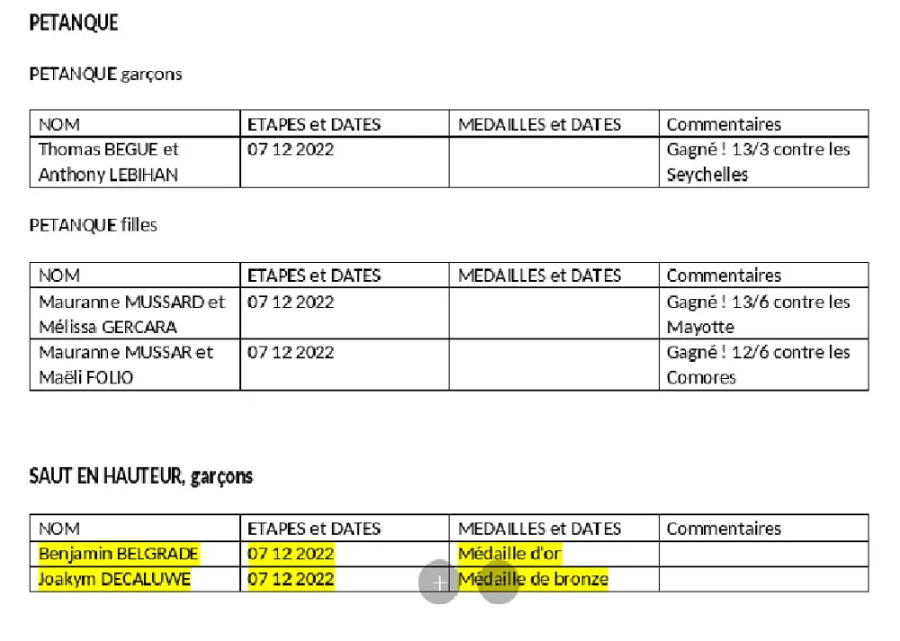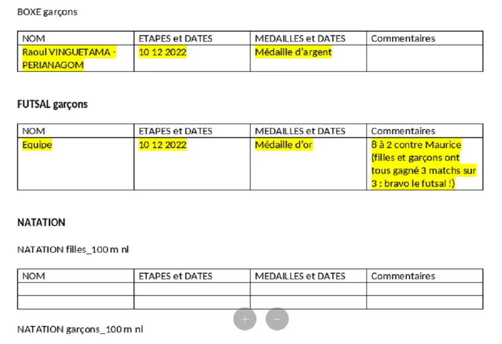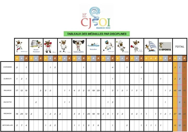 La liste des médailles par pays ou île et autre tableau par discipline. (Chiffres officiels de l’organisateur mauricien.)