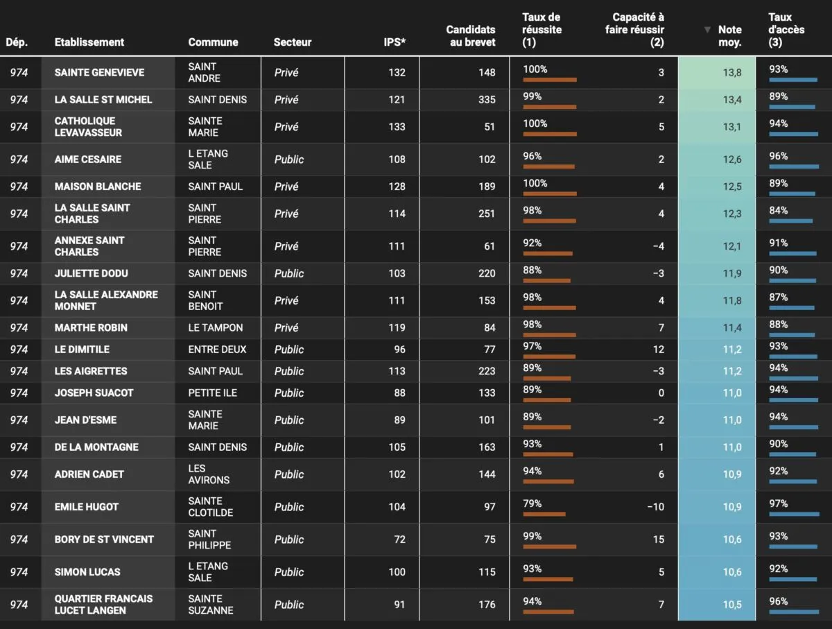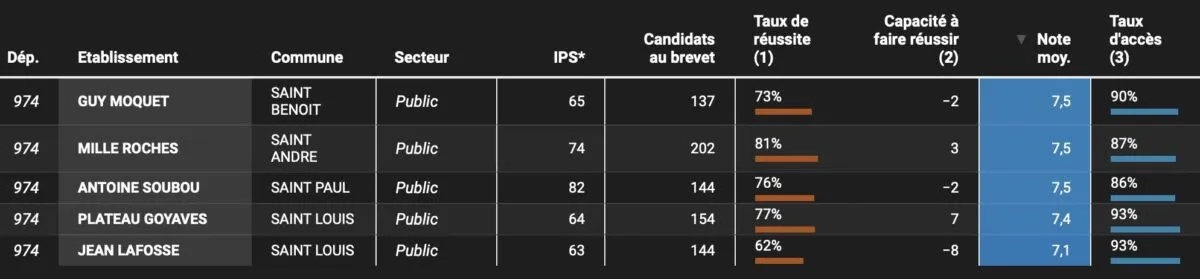 ©* L’IPS (Indice de position sociale) permet d’appréhender le statut social des élèves à partir des professions et catégories sociales de leurs parents. Plus la valeur est élevée, plus les familles sont favorisées. (1) Taux de réussite constaté au brevet en 2022. Pourcentage de ceux qui ont réussi l’examen parmi ceux qui l’ont tenté, en série générale. (2) En tenant compte du milieu social et du niveau (différence entre le taux d’accès constaté et le taux d’accès attendu). (3) Taux d’accès constaté au brevet depuis la 6ème, jusqu’à la réussite à l’examen, avec une scolarité complète dans l’établissement.