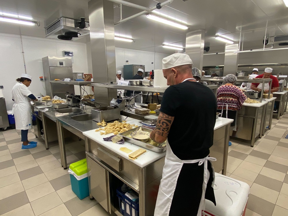 1. Mi comprend pi rien, normalement en cuisine vous devez avoir une tenue veste pantalon calot ou charlotte bien qui ramasse bien les cheveux, des gantsour la manipulation des matières dites sensibles, pas de bijoux . …. et que je vois … faudra faire aussi de l’hygiène et sécurité avant d’ouvrir ce genre de manifestations. Heins ou va t-on?