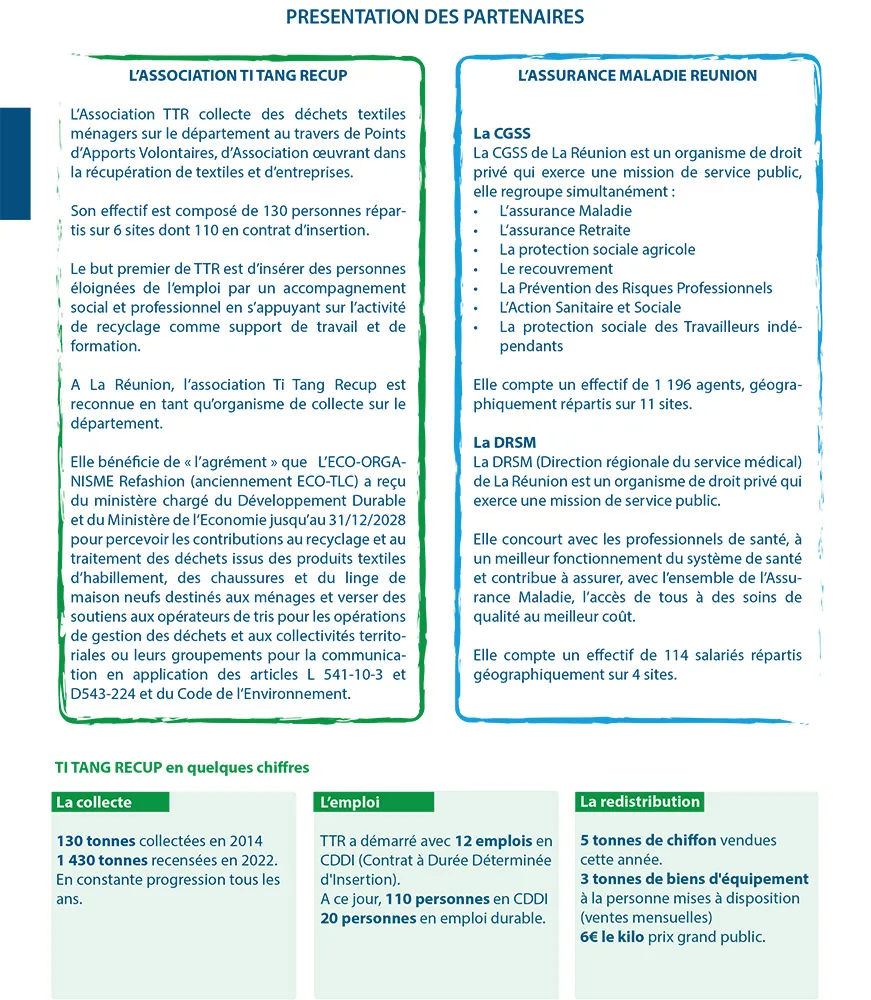 A La Réunion, la filière de recyclage des TLC (Textiles, Linge de Maison et Chaussures) est assurée par l’Association Ti Tang Récup nommée TTR. Cette action de recyclage s’inscrit dans un cercle vertueux que l’Assurance Maladie entend intégrer dans le cadre de sa politique de développement durable.