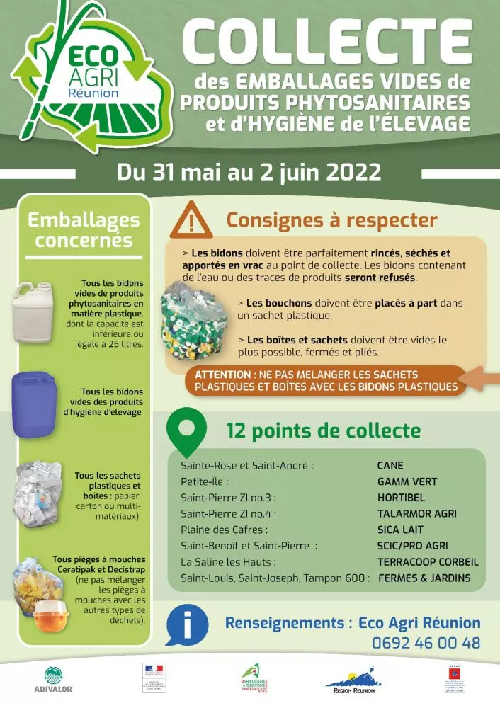 L’association Eco Agri Réunion organise une collecte des Emballages Vides de Produits Phytosanitaires et d’hygiène d’élevage (EVPP) du 31 mai au 02 juin 2022.