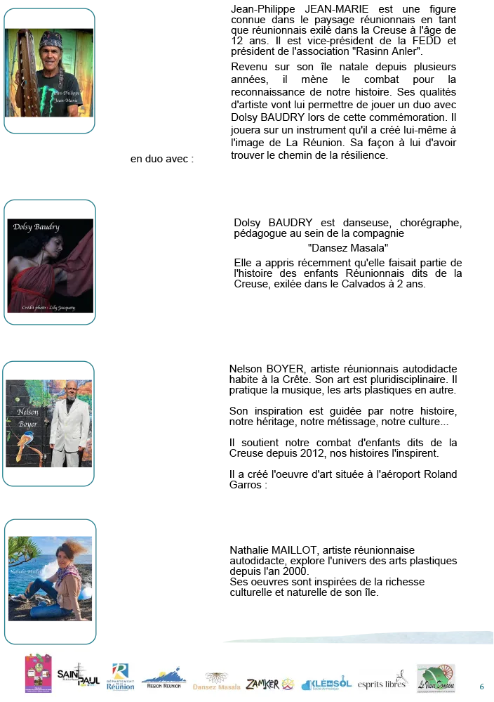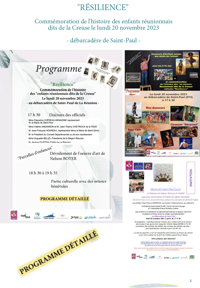 L’artiste Nelson BOYER dévoilera son oeuvre unique intitulée « PARCELLES D’ENFANCES ». Cet évènement important se déroulera en présence des élus, des médias, de nos soutiens, des survivants (certains se déplaçant de l’Hexagone dont Jocelyn A-POI, exilé dans la Creuse à 13 ans et qui revient sur son île natale pour la 1ère, 58 ans après son déracinement).