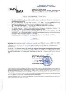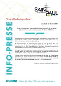 Nous vous prions de trouver ci-dessous le communiqué de presse émis par la Ville de Saint-Paul, ainsi que l’arrêté municipal relatif à la fermeture temporaire de l’école maternelle de La Saline. Cette décision fait suite aux incidents survenus ce vendredi matin.