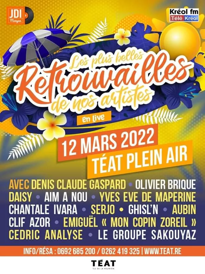 Seront présents : DENIS CLAUDE GASPARD – CLIF AZOR – AUBIN – OLIVIER BRIQUE – YVES EVE de MAPERINE – SERJO – DAISY – CHANTALE IVARA – AIM A NOU – DENIS & Ghisl’n – Cédric ANALYSE & ÉMIGUËL (Mon copin zoreil) – Le groupe SAKOUYAZ.