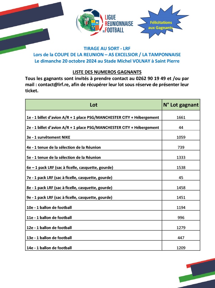 Les numéros gagnants sont désormais disponibles et peuvent être consultés dans le document joint. La Ligue Réunionnaise de Football encourage toutes les personnes présentes lors de cet événement à vérifier leurs billets pour savoir si elles ont remporté un lot.