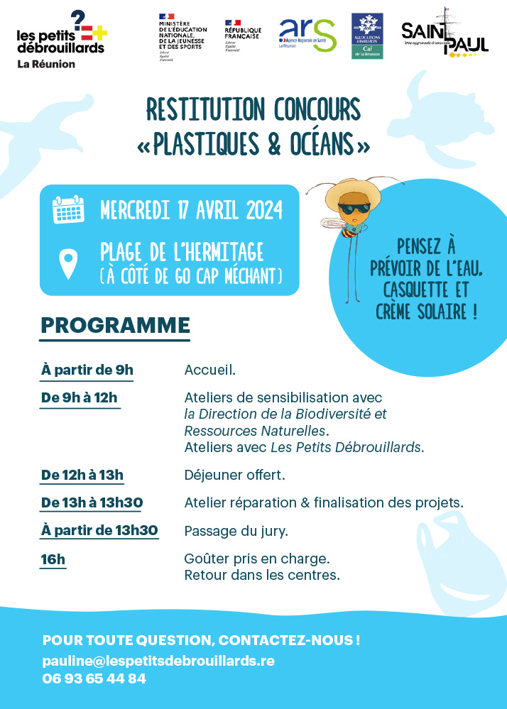 Nous aurons donc l’honneur d’accueillir 62 enfants et 10 animateurs dans le cadre de ce concours afin qu’un jury sélectionne l’équipe gagnante. A cette occasion, nous avons inviter Mme Nila RADAKICHENIN, M. Salim NANA-IBRAHIM et Mme Virginie Sallé à participer à ce jury et à cet évènement : Le Mercredi 17 avril à partir de 13h à la plage de l’Hermitage (à côté de Go Cap méchant).