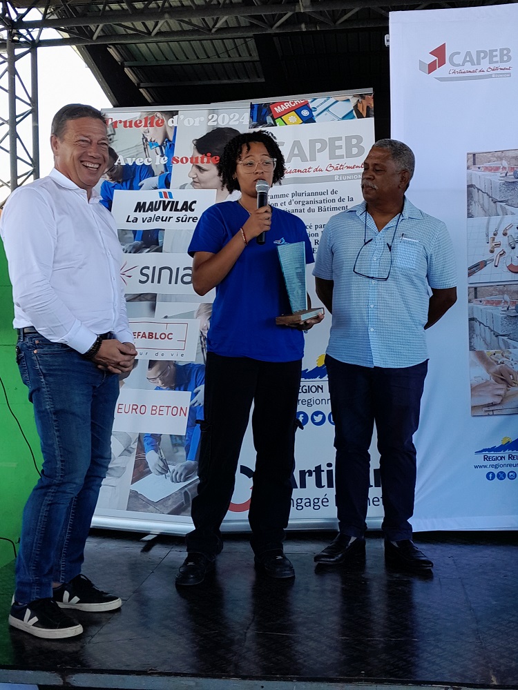 Parmi eux, nous avons eu le plaisir de voir évoluer Amélie Testac du lycée polyvalent Paul Moreau, Manon Bordas du lycée de Bois d’Olive, et Jovany Grondin du lycée professionnel Roches Maigres. Malgré l’absence d’un des candidats inscrits, la compétition a été féroce. Après une délibération minutieuse du jury, c’est Amélie Testac qui a brillé et a été désignée grande gagnante du concours de la Truelle d’Or dans la catégorie Peinture-Décoration, faisant honneur à son école et à son métier.