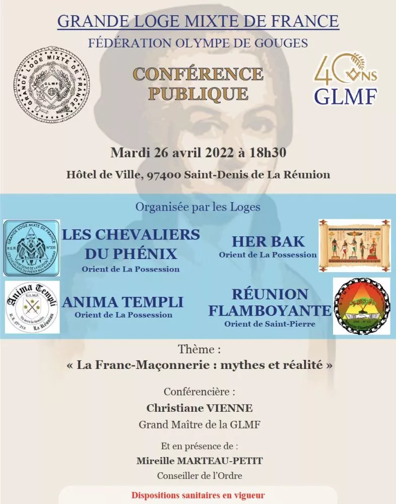 La Franc Maçonnerie et ses mystères ont toujours intrigué. Découvrez cette conférence qui vous permettra de lever le voile sur ce qui a toujours été caché à Saint Denis, 18H30, dans le Grand Salon de l’hôtel de Ville ce mardi 26 avril. Cette conférence est gratuite ouverte au grand public, et sera précédée d’un mini concert acapella de l’artiste Maeva Fourez.