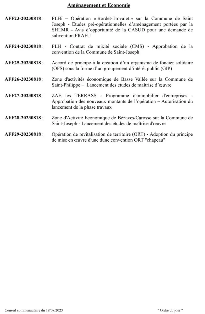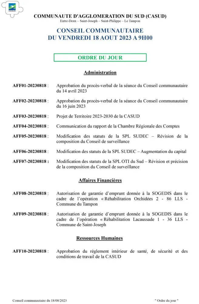 Le conseil communautaire de la CASUD se tient ce vendredi matin à la salle d’animation du 12eme km. Près d’une trentaine de sujets sont à l’ordre du jour de ce conseil communautaire.