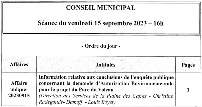 Par délibération du 24 juin 2023, le Conseil Municipal a émis un avis favorable au projet de construction d’un parc de loisirs nature dénommé Parc du Volcan, sur la Plaine des Cafres.