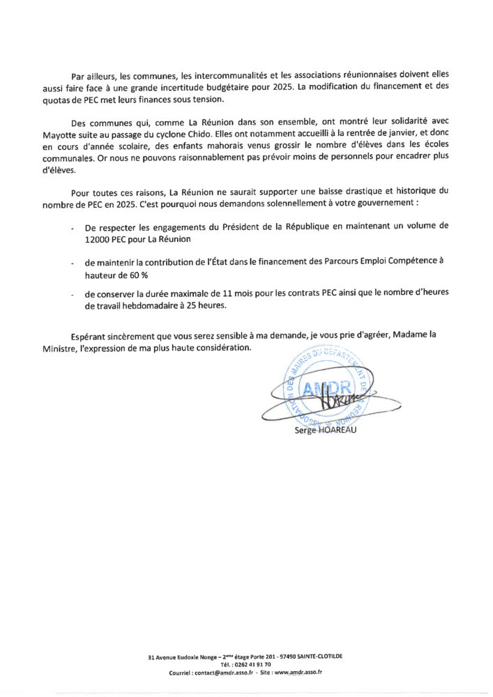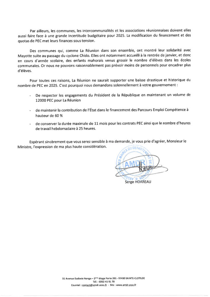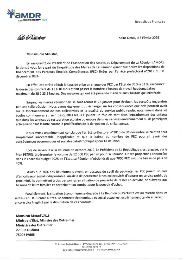 Face aux nouvelles dispositions de financement des Parcours Emplois Compétences (PEC) à La Réunion, le Président de l’Association des Maires de La Réunion (AMDR) a désigné plusieurs courriers au Premier Ministre François Bayrou, au Ministre d’État chargé des Outre -mer Manuel Valls, ainsi qu’à la Ministre du Travail, de la Santé, des Solidarités et des Familles Catherine Vautrin. À travers ces échanges, il exprime « l’inquiétude des élus réunionnais quant à l’impact de ces mesures sur l’emploi et la cohésion sociale du territoire ».