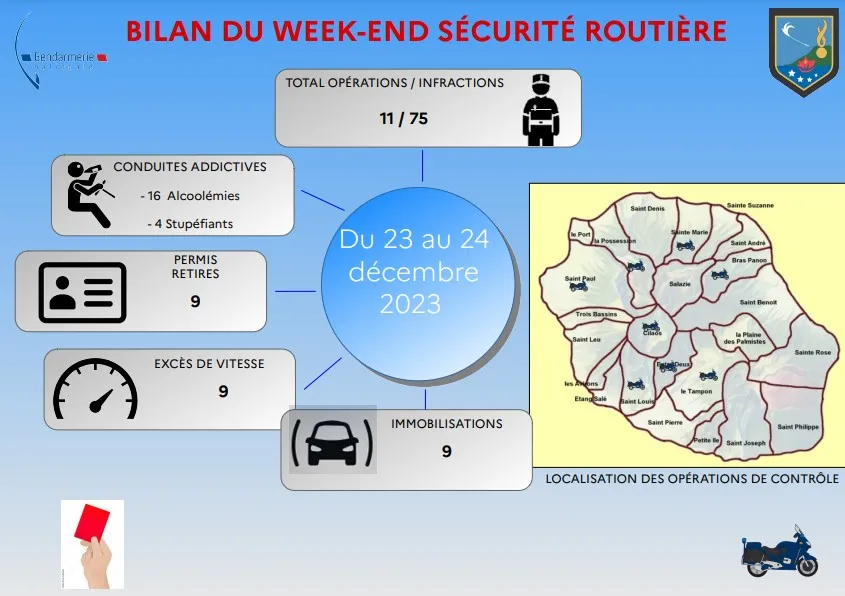 Actualités Contrôles routiers : 75 infractions et 9 véhicules immobilisés les 23 et 24 décembre par La Rédaction 25 décembre 2023 1 min de lecture Les 23 et 24 décembre, l’équipe de la gendarmerie nationale a effectué des contrôles routiers sur nos routes. Sur les 11 opérationes réalisées, 75 infractions ont été relevées et 9 véhicules ont été immobilisés. Ne manquez pas toute l’actualité de La Réunion ! Abonnez-vous à la newsletter de Free Dom ! Valider Partager Facebook Twitter Pinterest Linkedin Whatsapp Reddit Email Vous pourriez être intéressé par 3 janvier 2026 Samedi 3 janvier 2026 – Météo, éphéméride et horoscope du jour 2 janvier 2026 1 janvier 2026 Jeudi 1ᵉʳ janvier 2026 – Météo, éphéméride et horoscope du jour La Rédaction Laisser un commentaire Annuler la réponseYour email address will not be published. Enregistrer mon nom, mon e-mail et mon site dans le navigateur pour mon prochain commentaire. Current ye@r * Leave this field empty Article précédent St-Benoît : incendie au rond-point de Bras Fusil cette nuit Article suivant Un individu décède dans une explosion suivie d’un incendie survenue cette nuit Articles récents... Samedi 3 janvier 2026 – Météo, éphéméride et horoscope du jour Jeudi 1ᵉʳ janvier 2026 – Météo, éphéméride et horoscope du jour Mercredi 31 décembre 2025 – Météo, éphéméride et horoscope du jour Hommage à Johnny Hallyday sur Free Dom 2 ce 5 décembre Mardi 30 décembre 2025 – Météo, éphéméride et horoscope du jour Saint-Joseph : découverte de 2337 plants de cannabis, arrestation de 2 individus Point sur le réseau routier départemental, 29 décembre à 16H30 Suicide sur le pont de la Rivière d’Abord : importante mobilisation des secours et des forces de l’ordre Radier submergé à Ilet Furcy : la route de Cilaos fermée à la circulation cette nuit