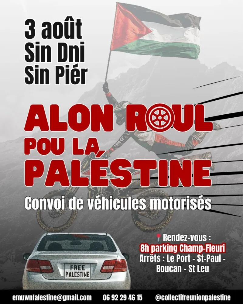 Les collectifs Groupaz Larényon-Paléstine et Collectif La Réunion-Palestine organisent un convoi au départ de Saint-Denis en direction de Saint-Pierre.