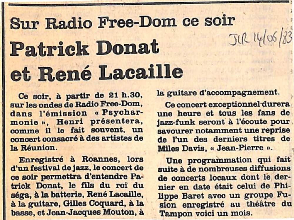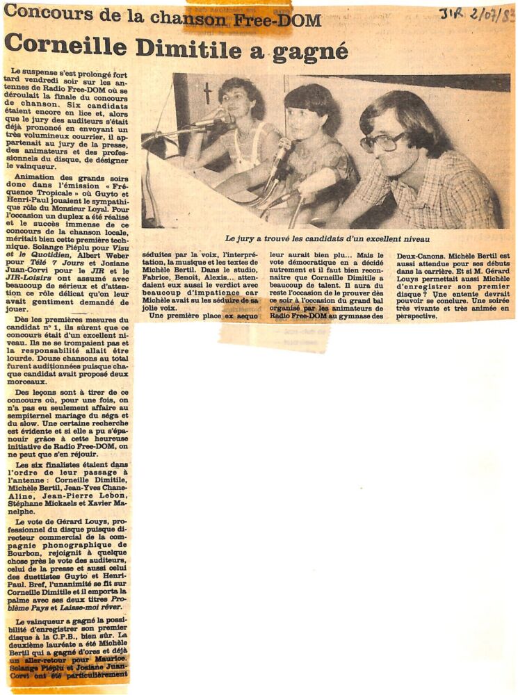 1983 Corneil Domitile gagne le concours de la chanson organisé par Radio Free Dom par La Rédaction 2 juillet 1983 1 min de lecture C’est Corneil Domitile qui a gagné le concours de la chanson organisé par Radio Free Dom avec 2 titres : Problème pays et Laisse-moi rêver. Ne manquez pas toute l’actualité de La Réunion ! Abonnez-vous à la newsletter de Free Dom ! Valider Partager Facebook Twitter Pinterest Linkedin Whatsapp Reddit Email Vous pourriez être intéressé par 10 décembre 1983 Une pub qui termine ces trois années d’existence 31 août 1983 Camille Sudre : « Le but poursuivi par Radio Free Dom : ne jamais se prendre au sérieux et ouvrir l’antenne à tous ceux qui veulent s’exprimer, sans aucune exclusive » 14 juin 1983 La vie quotidienne sur Radio Free Dom La Rédaction Laisser un commentaire Annuler la réponseYour email address will not be published. Enregistrer mon nom, mon e-mail et mon site dans le navigateur pour mon prochain commentaire. Current ye@r * Leave this field empty Article précédent La vie quotidienne sur Radio Free Dom Article suivant Camille Sudre : « Le but poursuivi par Radio Free Dom : ne jamais se prendre au sérieux et ouvrir l’antenne à tous ceux qui veulent s’exprimer, sans aucune exclusive » Articles récents... Hommage à Johnny Hallyday sur Free Dom 2 ce 5 décembre Mardi 30 décembre 2025 – Météo, éphéméride et horoscope du jour Saint-Joseph : découverte de 2337 plants de cannabis, arrestation de 2 individus Point sur le réseau routier départemental, 29 décembre à 16H30 Suicide sur le pont de la Rivière d’Abord : importante mobilisation des secours et des forces de l’ordre Radier submergé à Ilet Furcy : la route de Cilaos fermée à la circulation cette nuit Fortes pluies : appel à la plus grande prudence à Saint-Paul Saint-Gilles-les-Bains : une route impraticable, les riverains montent au créneau (VIDEOS) Très grands excès de vitesse : un délit passible de prison depuis le 29 décembre 2025 Fermeture temporaire du sentier de la Canalisation des Orangers (cirque de Mafate)