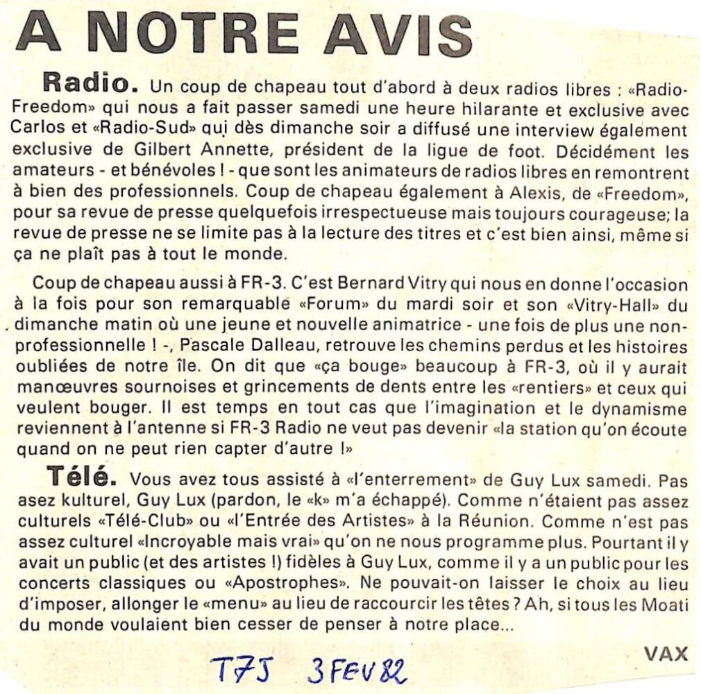1982 Coup de chapeau à Radio Free Dom et à Alexis par La Rédaction 3 février 1982 1 min de lecture (Télé 7 jours) Ne manquez pas toute l’actualité de La Réunion ! Abonnez-vous à la newsletter de Free Dom ! Valider Partager Facebook Twitter Pinterest Linkedin Whatsapp Reddit Email Vous pourriez être intéressé par 10 décembre 1982 Un canular par jour sur Radio Free Dom 11 octobre 1982 L’émission « pas de canard sans navet » 7 octobre 1982 L’émission « bleu outre-mer ou la radio de la méduse… » La Rédaction Laisser un commentaire Annuler la réponseYour email address will not be published. Enregistrer mon nom, mon e-mail et mon site dans le navigateur pour mon prochain commentaire. Current ye@r * Leave this field empty Article précédent Thierry Gallut hypnotise des centaines d’auditeurs Article suivant Carlos interviewé par Pascaline Articles récents... Hommage à Johnny Hallyday sur Free Dom 2 ce 5 décembre Mardi 30 décembre 2025 – Météo, éphéméride et horoscope du jour Saint-Joseph : découverte de 2337 plants de cannabis, arrestation de 2 individus Point sur le réseau routier départemental, 29 décembre à 16H30 Suicide sur le pont de la Rivière d’Abord : importante mobilisation des secours et des forces de l’ordre Radier submergé à Ilet Furcy : la route de Cilaos fermée à la circulation cette nuit Fortes pluies : appel à la plus grande prudence à Saint-Paul Saint-Gilles-les-Bains : une route impraticable, les riverains montent au créneau (VIDEOS) Très grands excès de vitesse : un délit passible de prison depuis le 29 décembre 2025 Fermeture temporaire du sentier de la Canalisation des Orangers (cirque de Mafate)