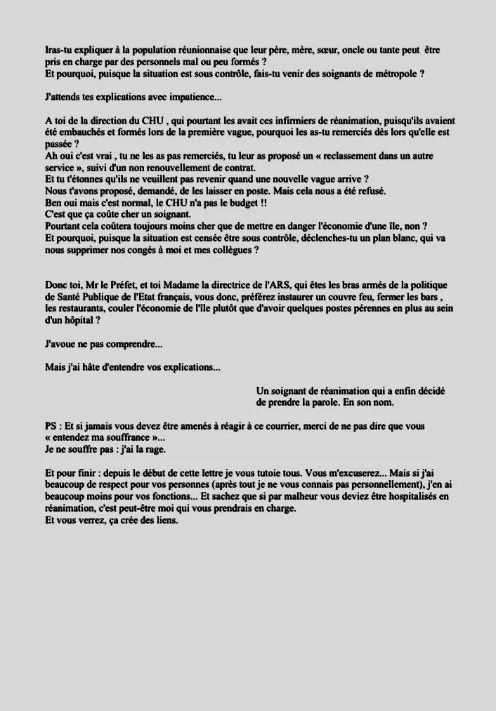 Un infirmier en réanimation a adressé une lettre ouverte au Préfet, à la directrice de l’ARS, au représentant syndical CFTC, au médecin de la CME et à la direction du CHU.