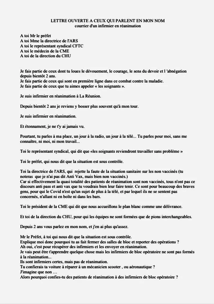 Avant de dire commenter ce courrier, verifiez bien l’authenticité. Un courrier anonyme. Comment être sûr que l’auteur n’est pas qqn qui veut manipuler l’opinion publique ? Et dans le cas où le courrier est authentique, il faut dire qu’il y a aussi une majorité de médecins et infirmières/infirmiers qui demandent à la population de se faire vacciner et de respecter les gestes barrières. Donc, quel avis estcplus représentatif?