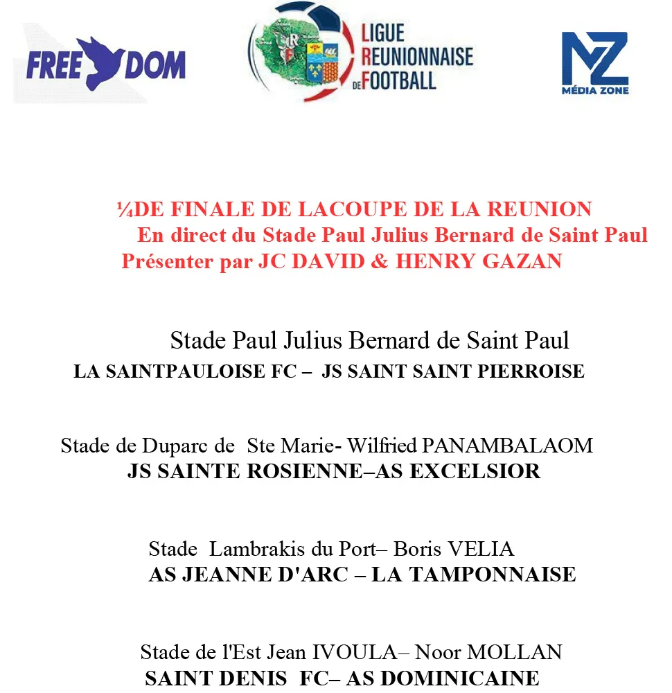 La Coupe de la Réunion poursuit son aventure ce mercredi 13 août avec les quarts de finale. Prise d’antenne dès 20h15 sur Free Dom, en direct du Stade Paul Julius Bernard à Saint-Paul, avec JC David et Henry Gazan aux commentaires.