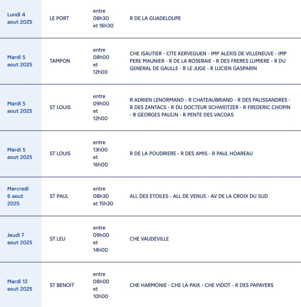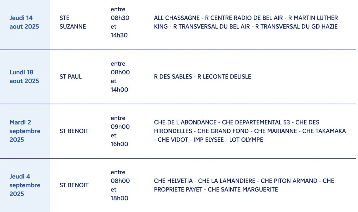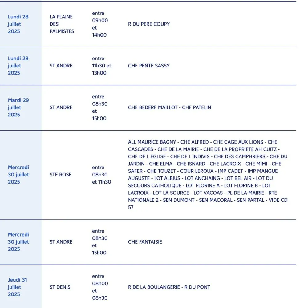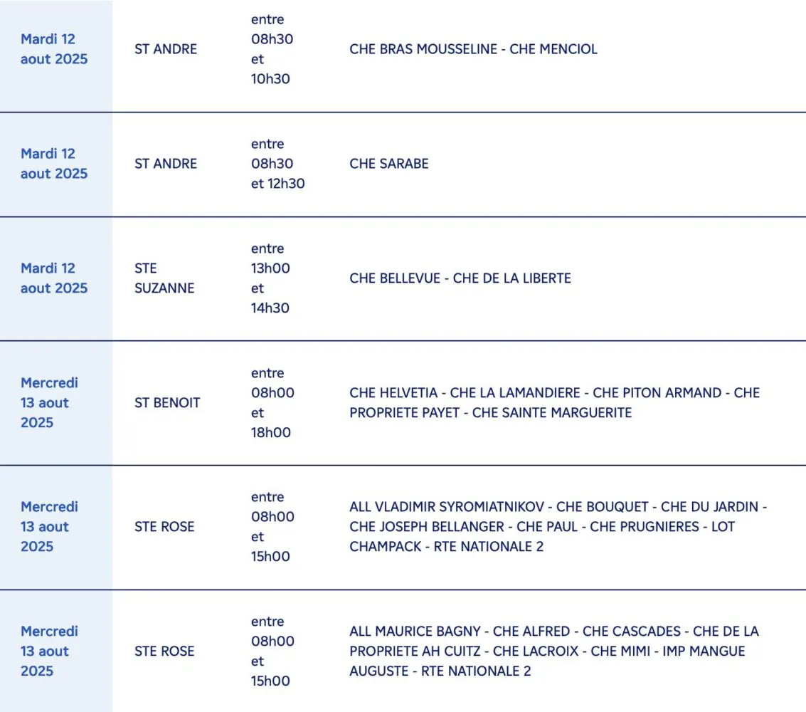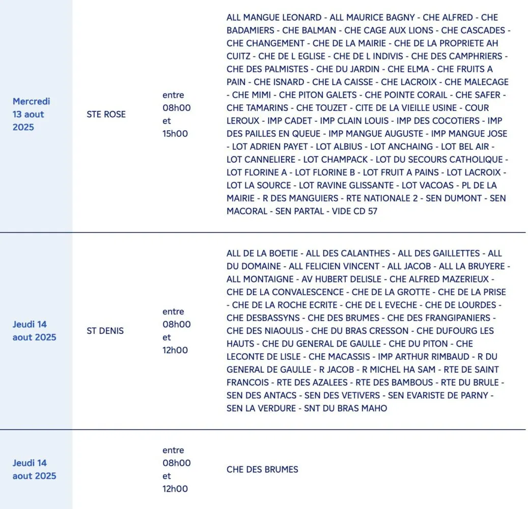 Sainte-Rose : de nombreux secteurs tels que Maurice Bagny, Alfred, Badamiers, Mairie, Palmistres, Piton Galets, Vacoas, Mangue Auguste, Nationale 2, etc. (8h00 – 15h00)